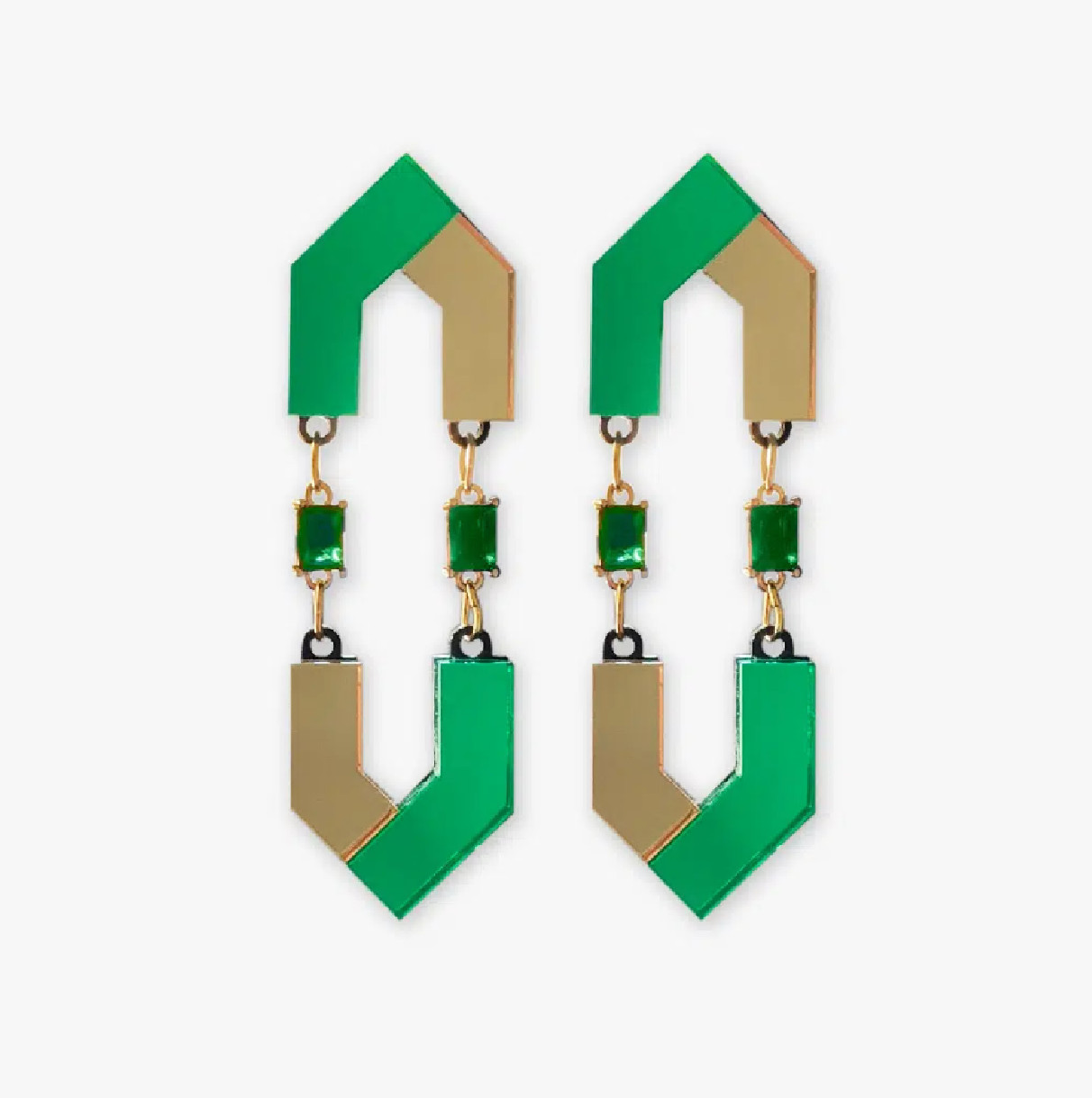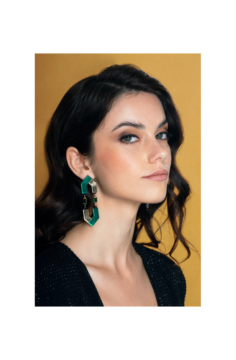 Colores: Verde y dorado suave espejo. Piedras en color verde esmeralda con fornituras doradas.