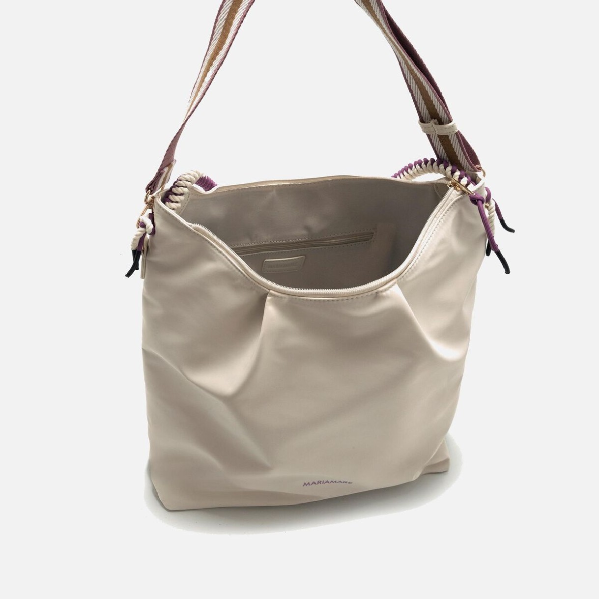 Bolso estilo hobo de color crema para mujer de la marca Mariamare, modelo Callis. Su asa trenzada en tonos morado y blanco es un detalle llamativo que contrasta con el diseño minimalista del bolso. Incluye cordones decorativos en morado y acabados metálicos dorados que añaden un toque moderno. Con espacio suficiente para organizar tus esenciales, este bolso es una opción ideal para complementar tus outfits casuales con un accesorio práctico y versátil.