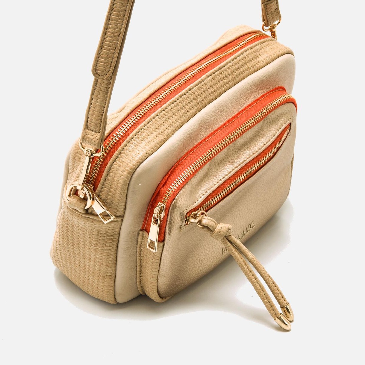 Bolso bandolera de mujer de color beige arena con detalles en naranja, modelo Casco de Mariamare. Este diseño práctico y compacto incluye múltiples compartimentos con cremalleras que permiten una organización eficiente. El contraste de colores añade un toque moderno y dinámico, mientras que la correa ajustable asegura comodidad para el día a día. Perfecto para complementar looks casuales, es un accesorio funcional y estiloso para cualquier ocasión.