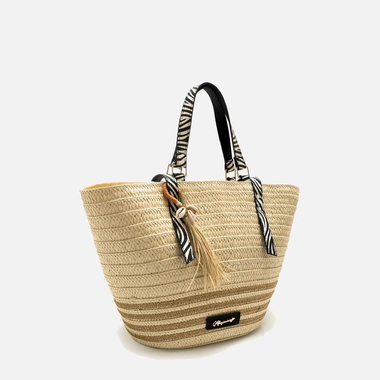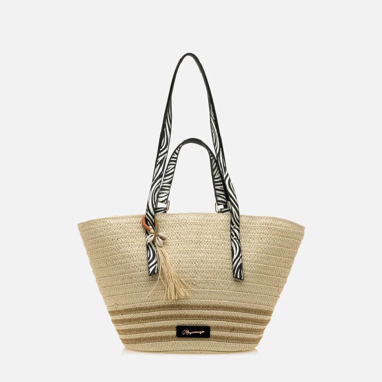 Bolso tipo capazo para mujer en rafia de papel color natural, modelo Acton de la marca Mariamare. Este modelo destaca por su diseño amplio y funcional, perfecto para acompañarte en días de playa o salidas casuales. Su doble asa corta y larga con estampado de cebra aportan un toque moderno y distintivo, mientras que los detalles colgantes con conchas y borlas reflejan un estilo fresco y veraniego. Su capacidad hace que sea ideal para llevar todo lo que necesitas con comodidad y estilo.