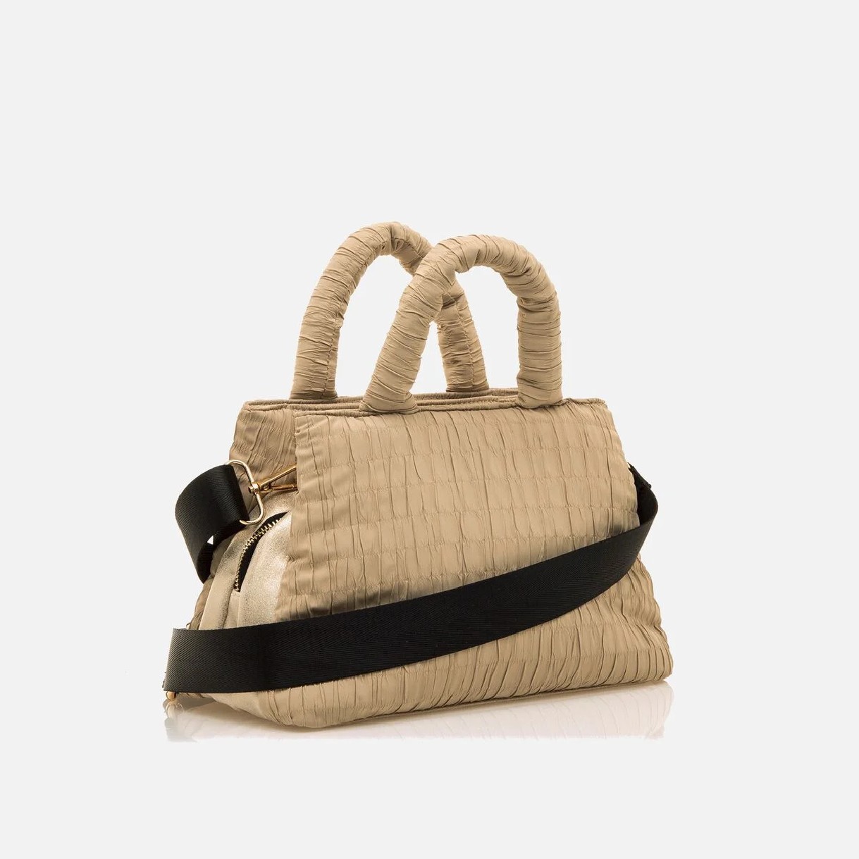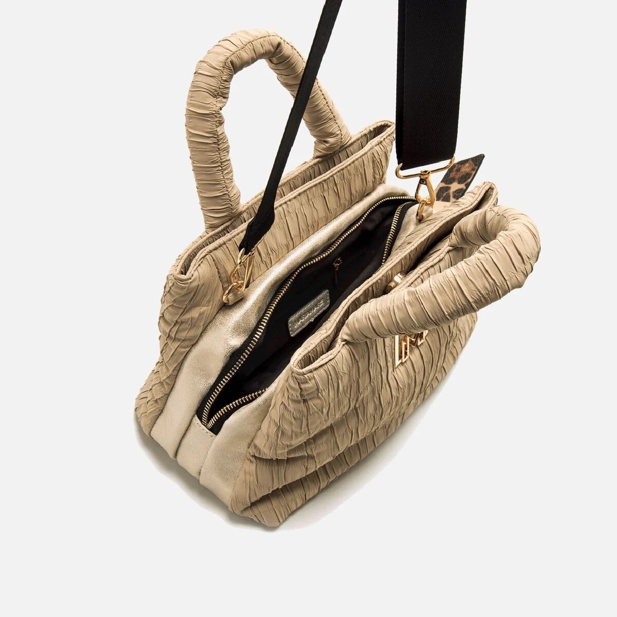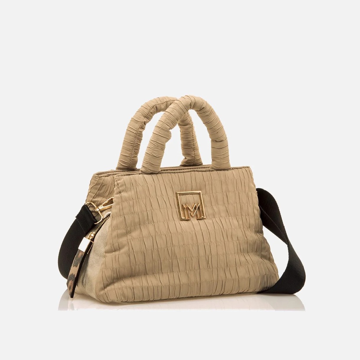 Bolso tipo tote de mujer, modelo Pila de Mariamare de color arena. Presenta un diseño acolchado con textura arrugada, asas superiores forradas a juego y correa negra ajustable para mayor versatilidad. Su forma estructurada y el logo metálico en el frontal aportan un toque distintivo que lo convierte en una opción práctica y moderna para el uso diario. Ideal para llevar lo esencial con comodidad y estilo.