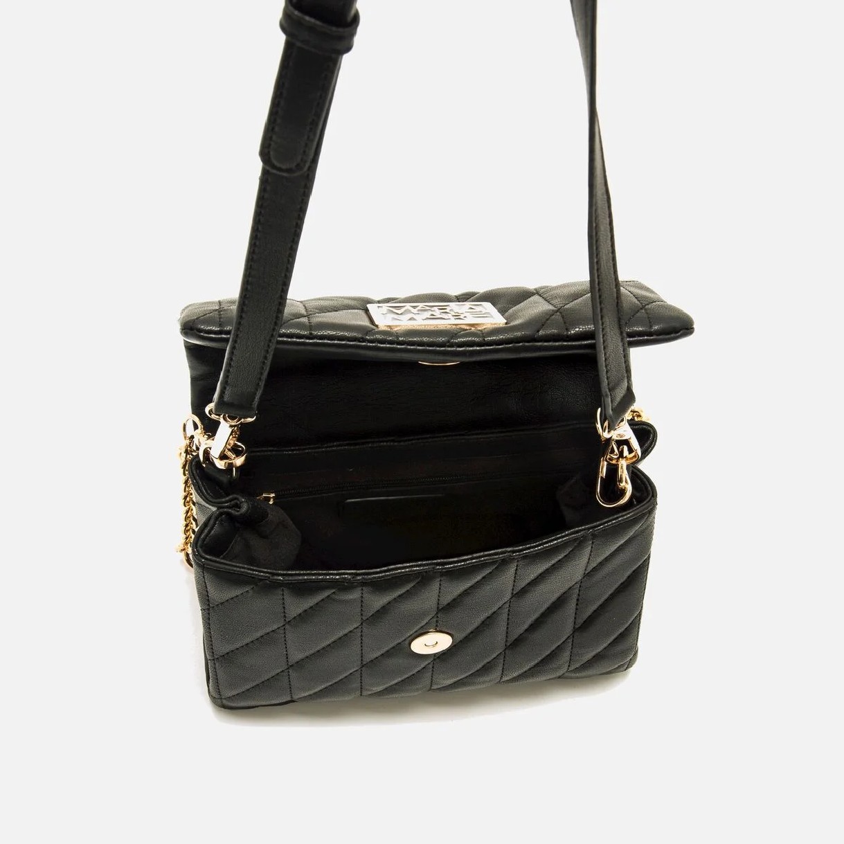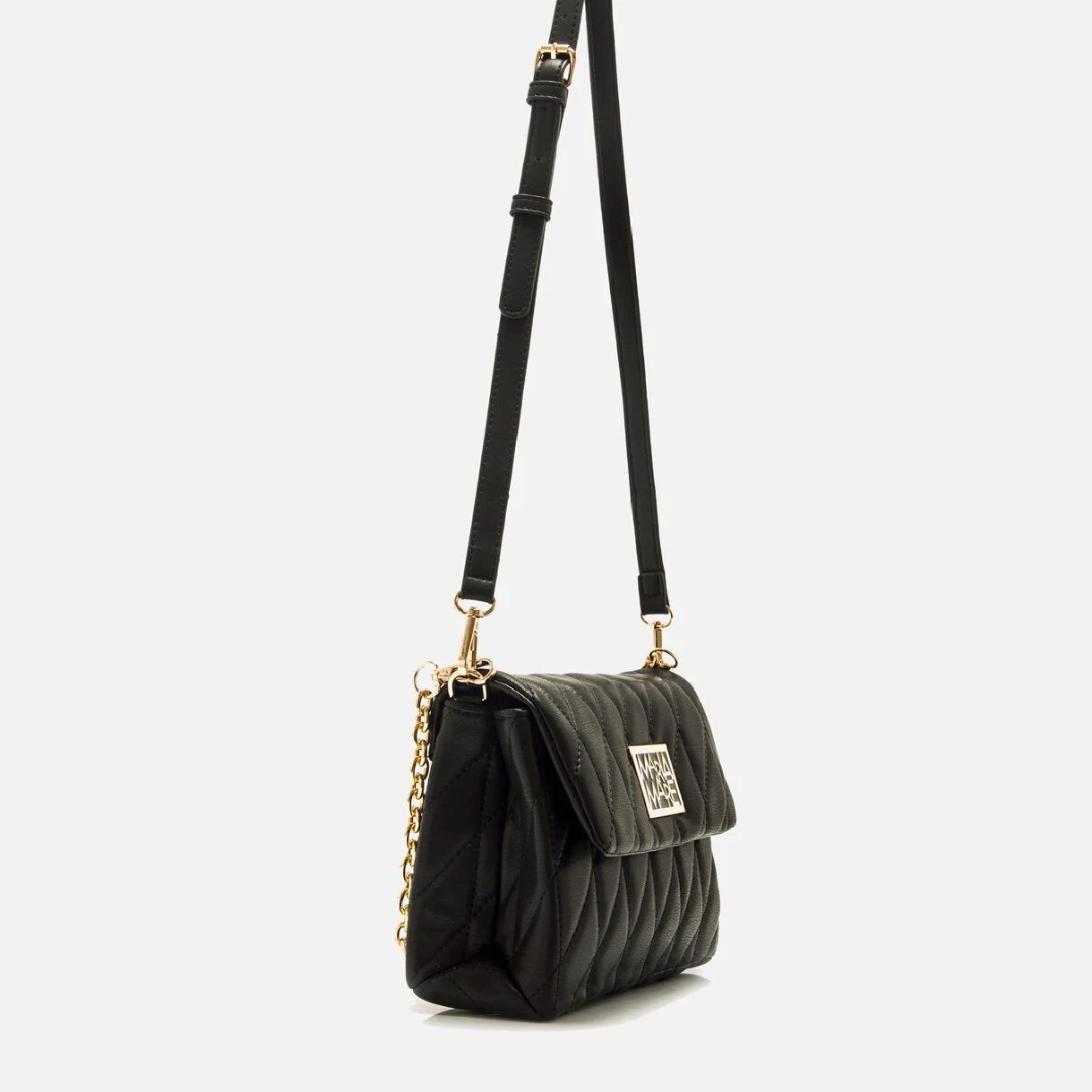 Bolso bandolera de color negro para mujer, modelo Sele de Mariamare. Su diseño acolchado con patrón de líneas diagonales y cierre de solapa le da un toque moderno y versátil. Incluye una correa combinada con cadena dorada y refuerzos a tono para mayor comodidad. El logo metálico dorado en el frontal completa el look de este bolso compacto, ideal para llevar lo esencial tanto en salidas informales como en ocasiones especiales.
