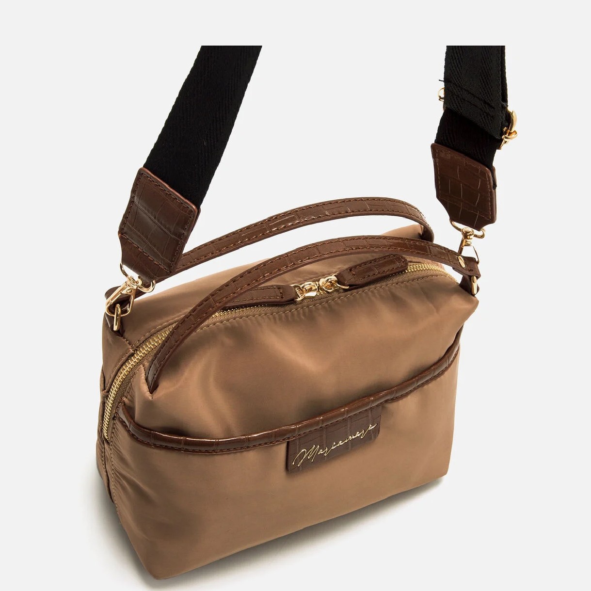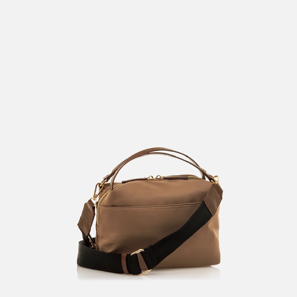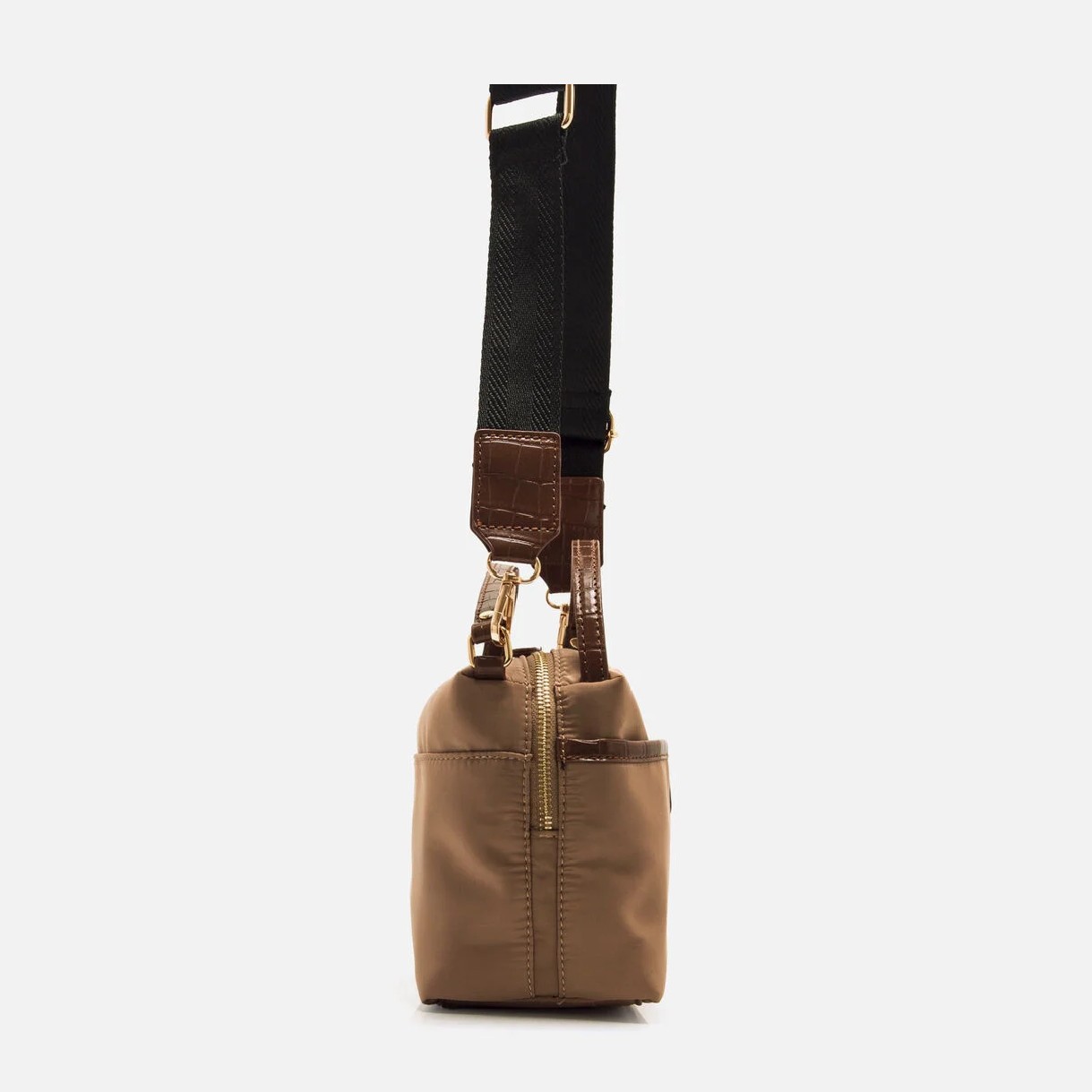 Bolso tipo bandolera de color taupe para mujer modelo Henar de Mariamare. Su diseño incluye una doble asa corta rígida y una correa negra ajustable tipo webbing para llevar al hombro o cruzado, adaptándose al ritmo diario. Detalles efecto cocodrilo en tono cuero y acabados metálicos en dorado aportan un estilo actual. Dispone de un compartimento principal con cremallera y bolsillo exterior de fácil acceso, pensado para tener lo esencial siempre a mano sin renunciar al estilo casual.