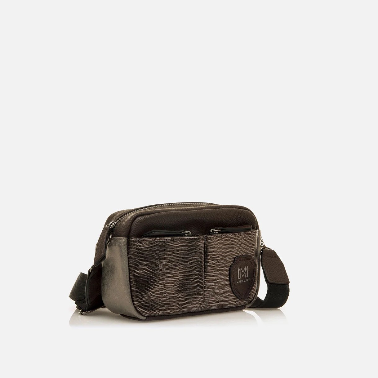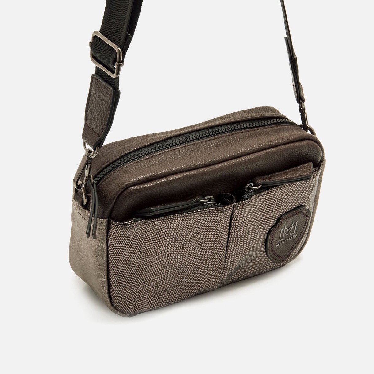 Bolso bandolera de color moka para mujer, modelo Nisi de Mariamare. Su diseño compacto y funcional incorpora dos bolsillos frontales en tono plomo metalizado con cierre de cremallera, ideal para tener a mano objetos pequeños. El cuerpo con textura efecto piel aporta un acabado visual llamativo sin renunciar a la comodidad del formato ligero. Incluye correa ajustable negra tipo webbing para mayor confort. El logo en relieve y el detalle metálico completan el estilo urbano de este modelo versátil.