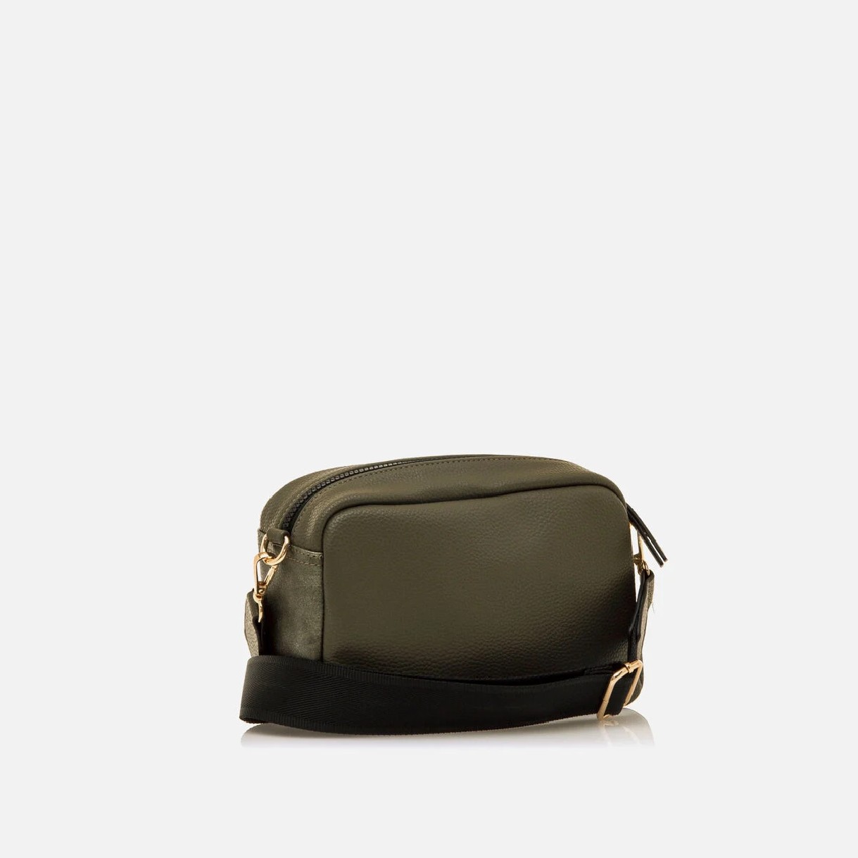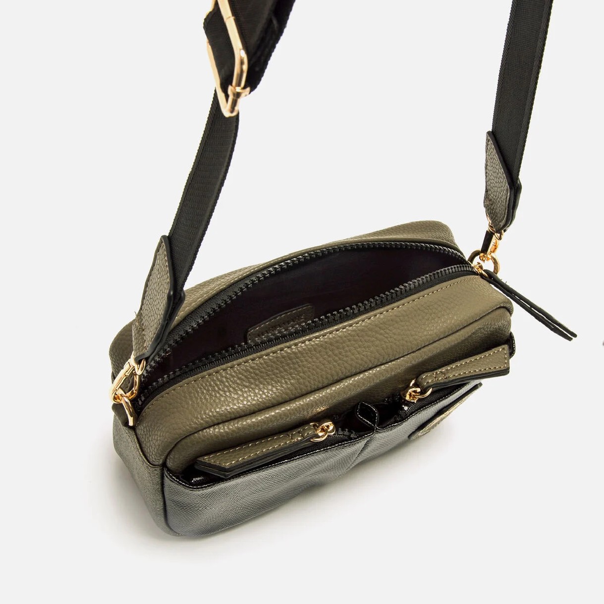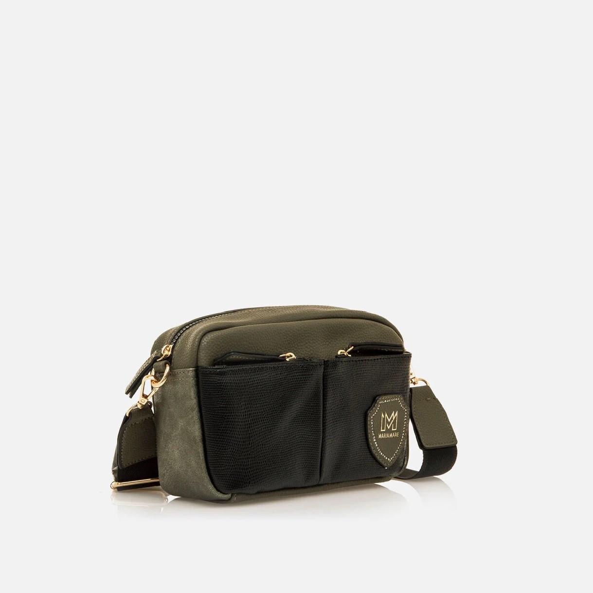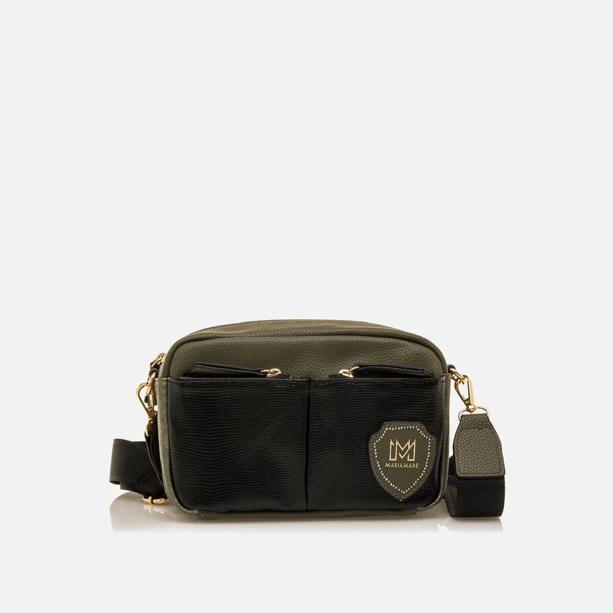 Bolso bandolera para mujer de Mariamare, modelo Nisi con diseño compacto de estilo urbano que combina cuerpo en verde kaki con bolsillos frontales negros texturizados. Su doble bolsillo exterior con cremallera permite organizar fácilmente pequeños objetos, mientras que el compartimento principal ofrece espacio para lo esencial. Incluye una correa ajustable para llevarlo cruzado con total comodidad. El escudo decorativo con el logo en la parte frontal aporta un toque distintivo y funcional.