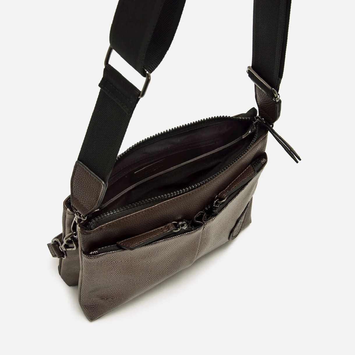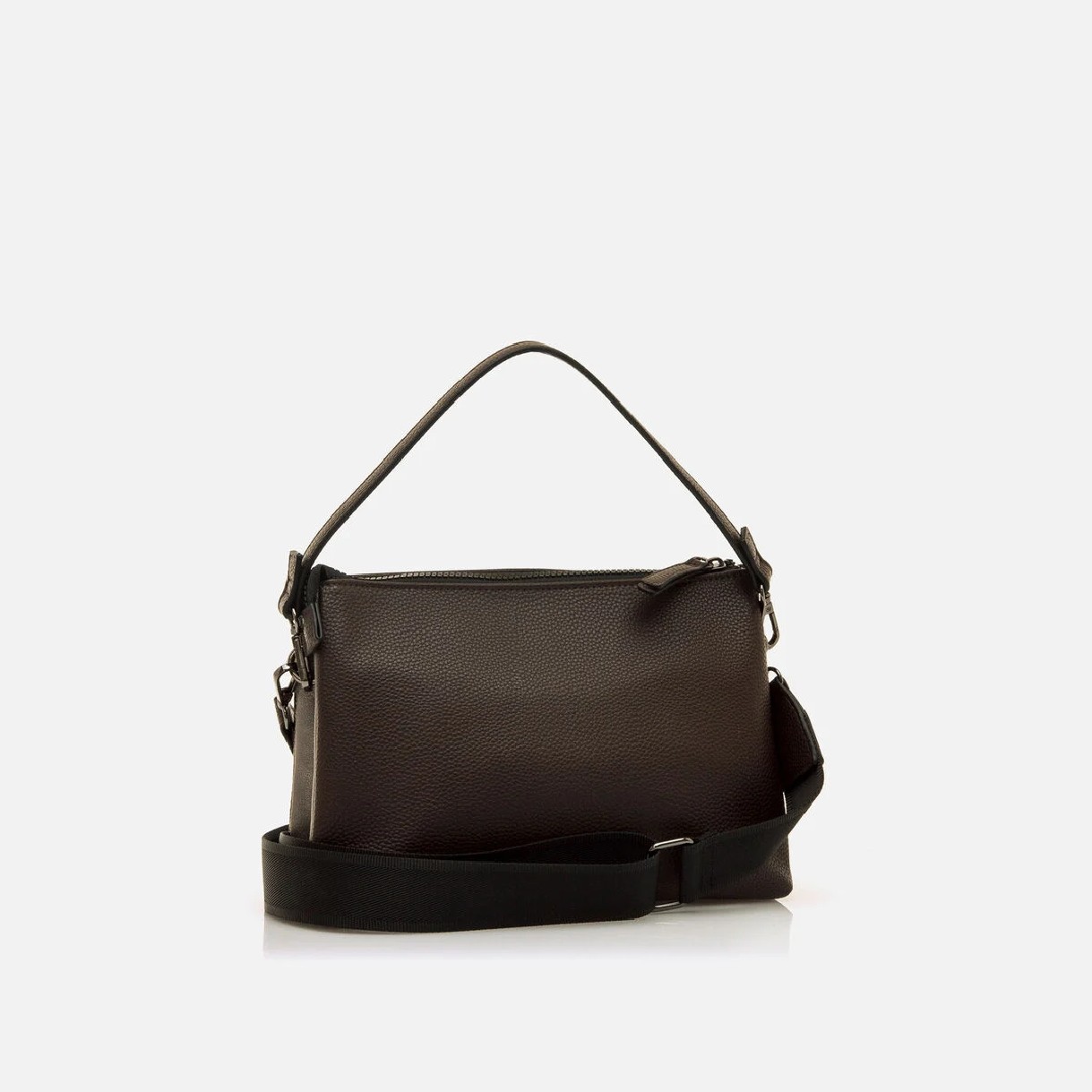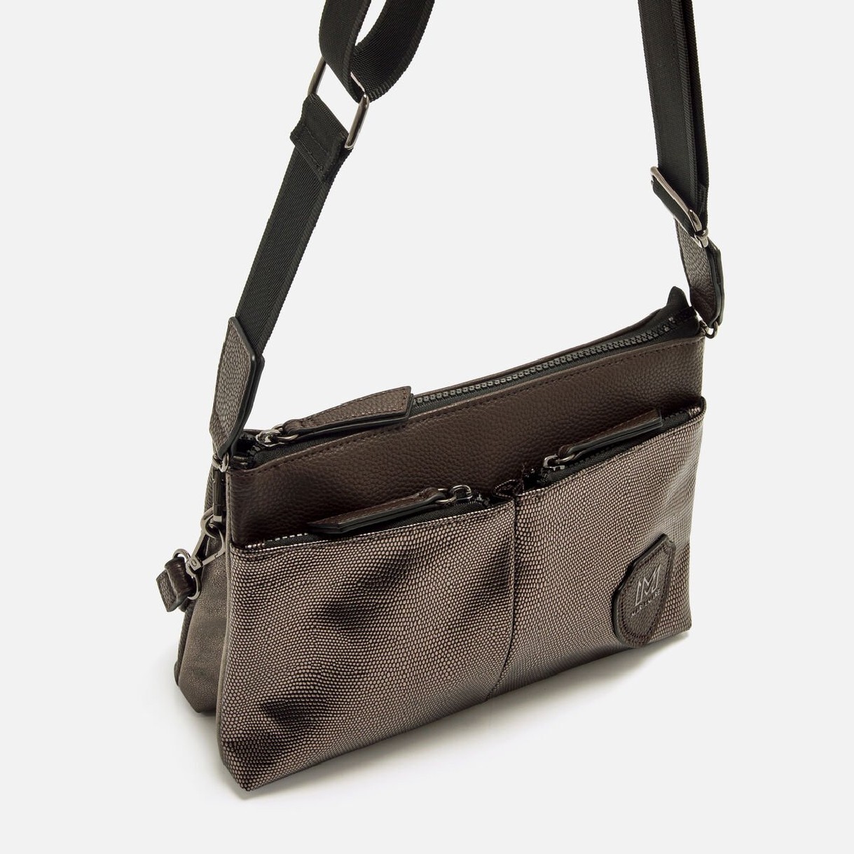 Bolso bandolera de color moka para mujer modelo Nila de Mariamare. Su diseño compacto combina texturas en contraste y presenta dos bolsillos frontales metalizados con cremallera para un acceso rápido y organizado. Dispone de un asa corta y una correa ancha ajustable para llevarlo al hombro o cruzado. El escudo con el logo de la marca en la parte frontal aporta un toque distintivo. Nila ofrece funcionalidad en un formato reducido con un diseño moderno.