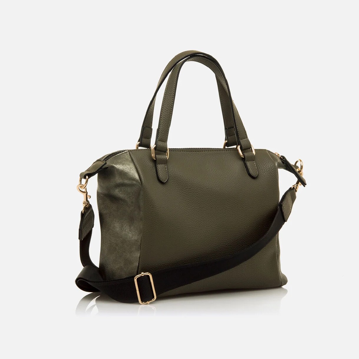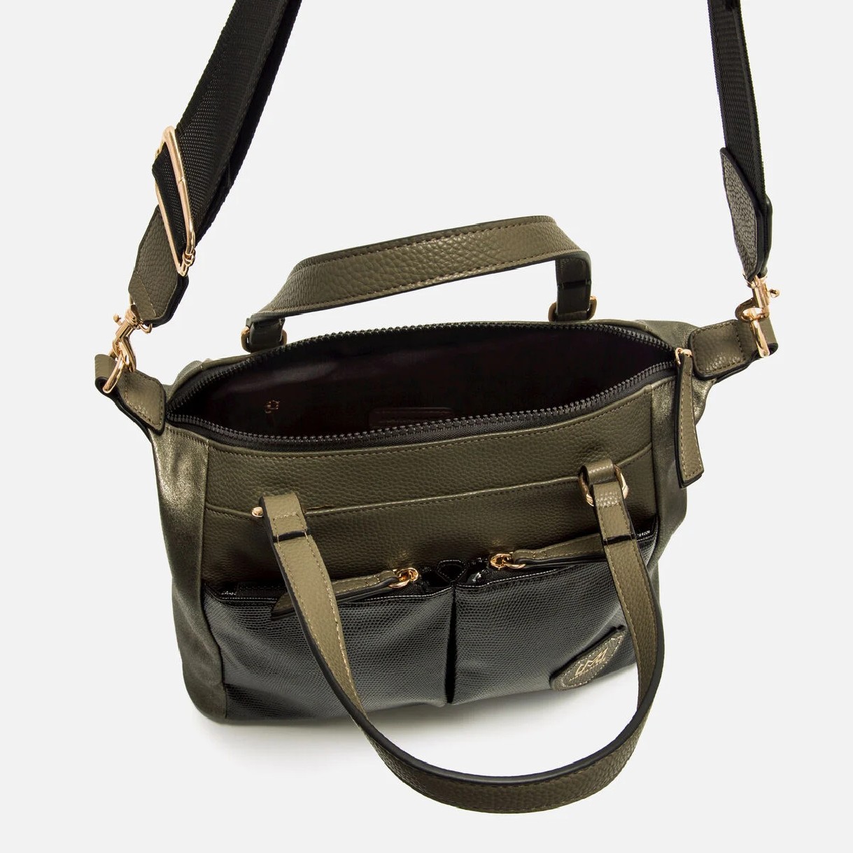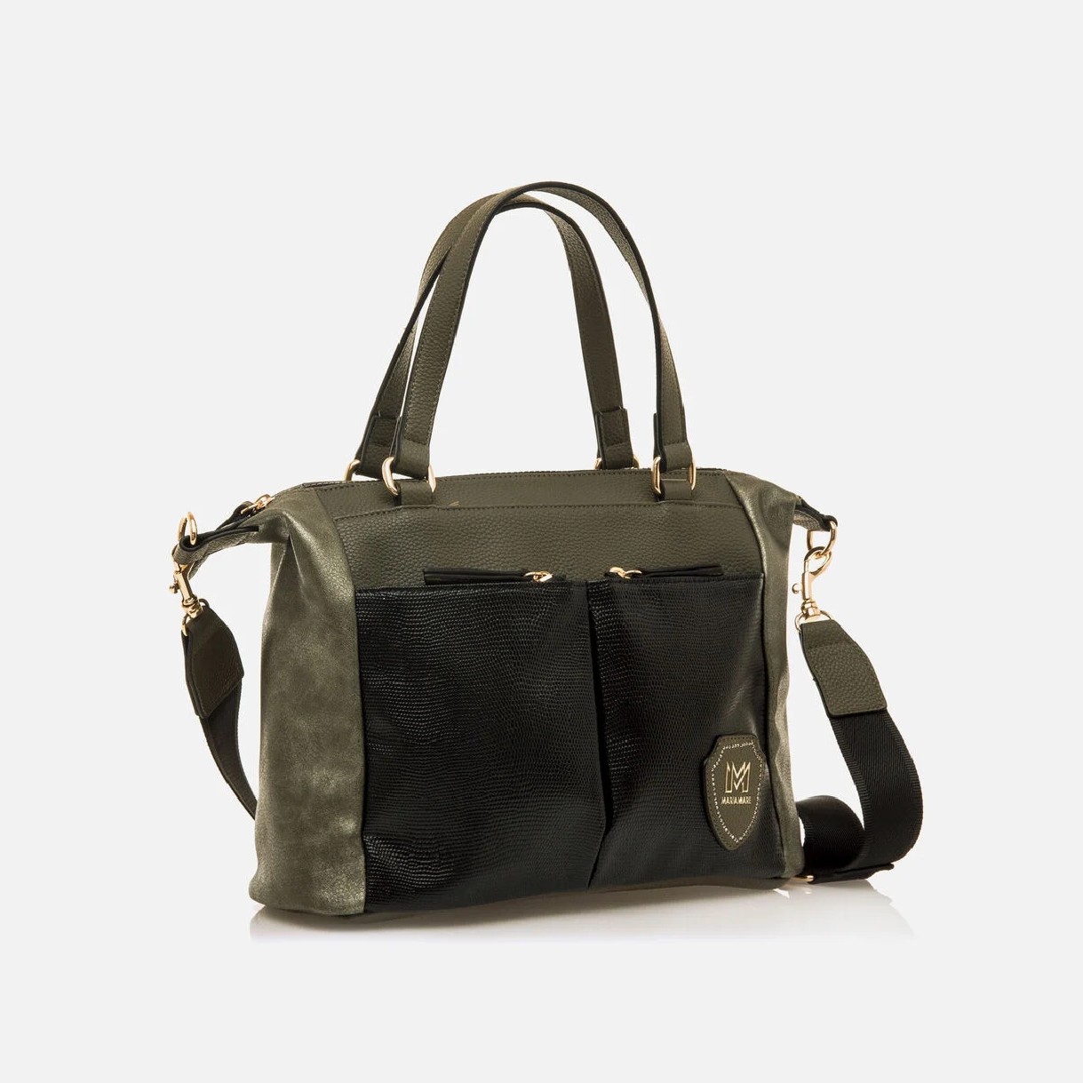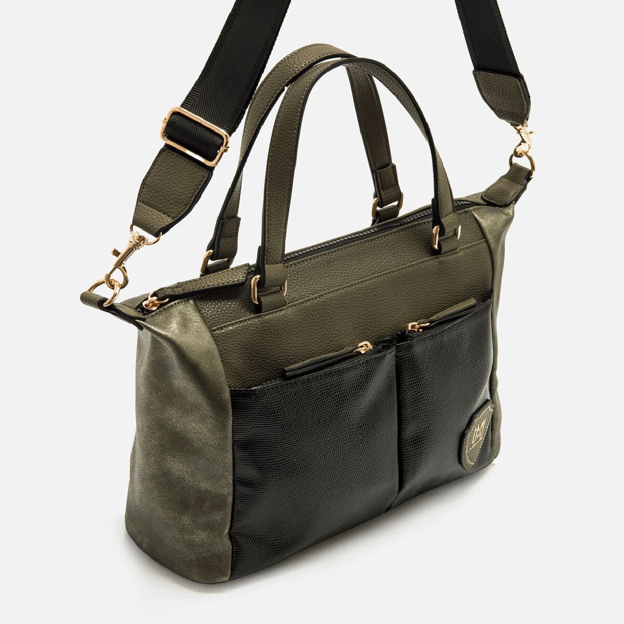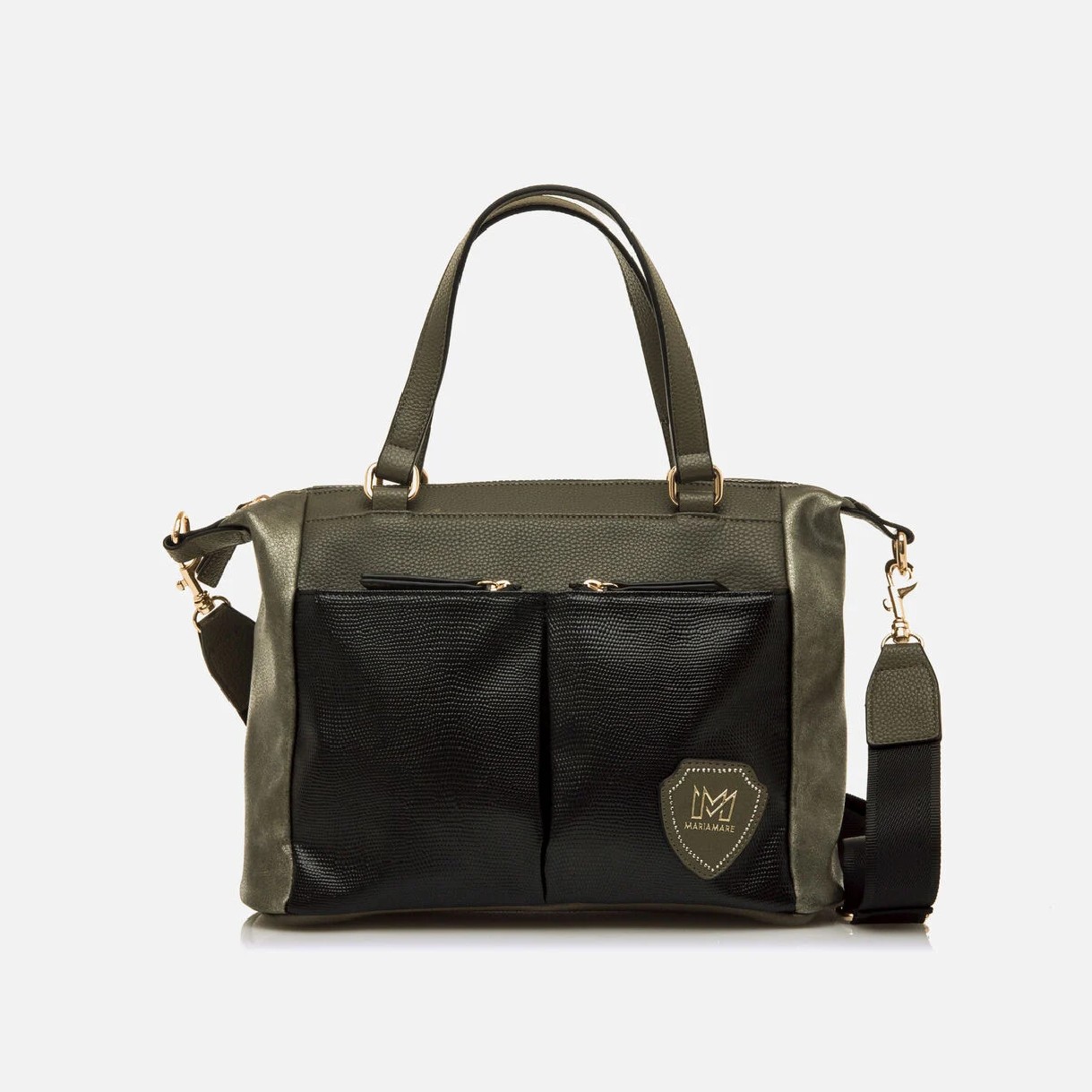 Bolso tipo bowling para mujer, modelo Nieve de Mariamare, con diseño bicolor texturizado que combina cuerpo verde kaki con bolsillos frontales en negro. Incluye doble asa corta y correa ajustable negra tipo webbing para llevarlo cruzado o al hombro, adaptándose a distintas situaciones. Sus dos bolsillos exteriores con cremallera permiten organizar pequeños objetos de forma práctica, mientras que el compartimento principal es amplio e ideal para el uso diario. El escudo decorativo con el logo aporta un detalle distintivo que refuerza su estilo funcional y urbano.
