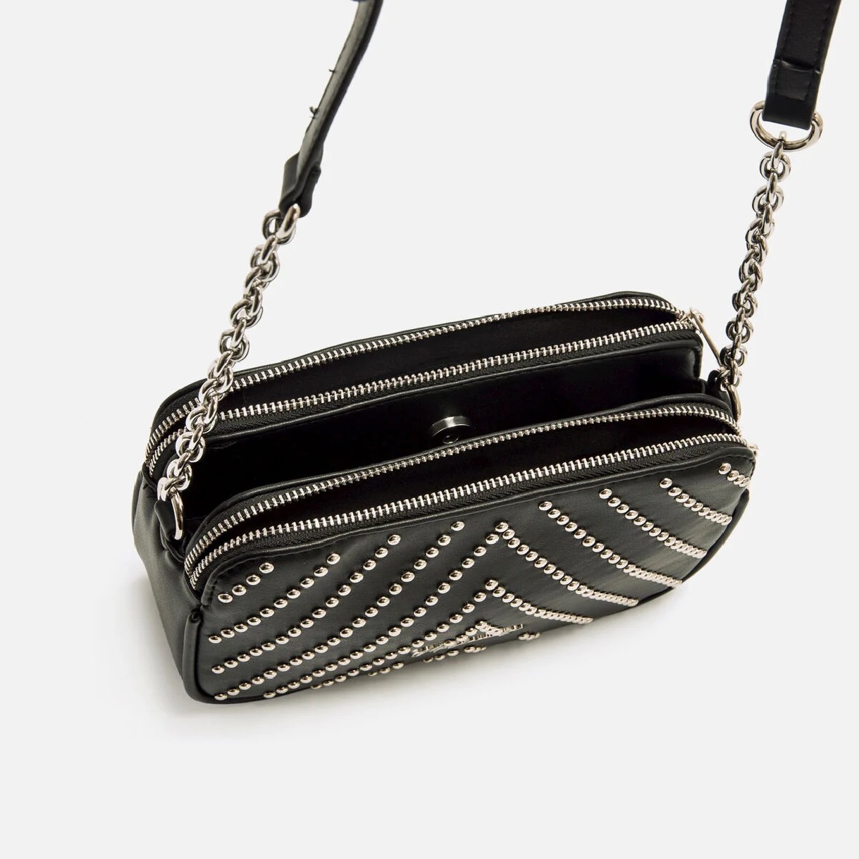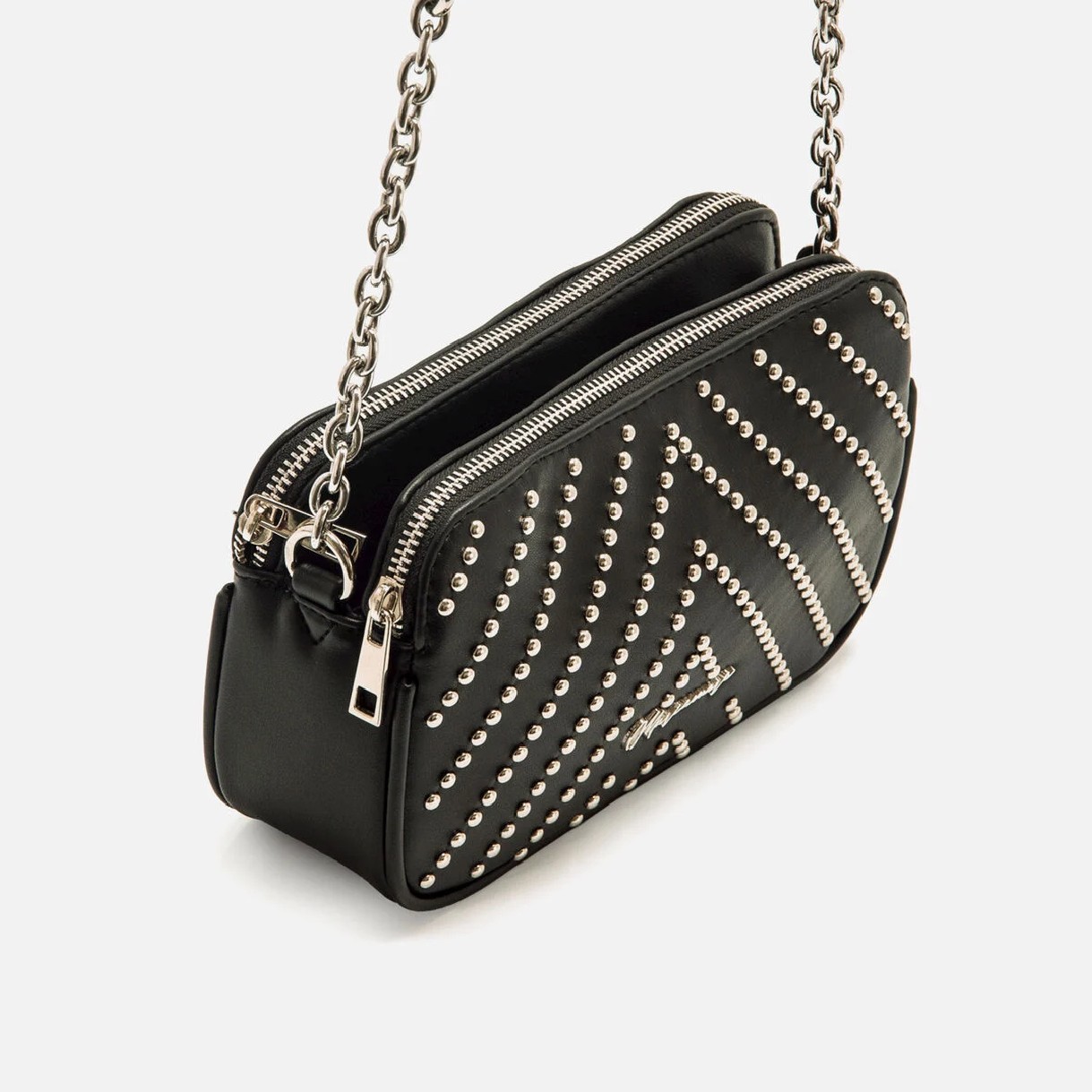 Bandolera de color negro para mujer, modelo Mones de la marca Mariamare. Su diseño compacto destaca por el patrón de tachuelas metálicas en forma de espiga, que aporta dinamismo y un toque atrevido. Incluye una cadena plateada con refuerzo al hombro para mayor comodidad. El logo de la marca aparece discretamente en plateado en el frontal. Perfecto para añadir personalidad a tus looks y llevar lo esencial con estilo.