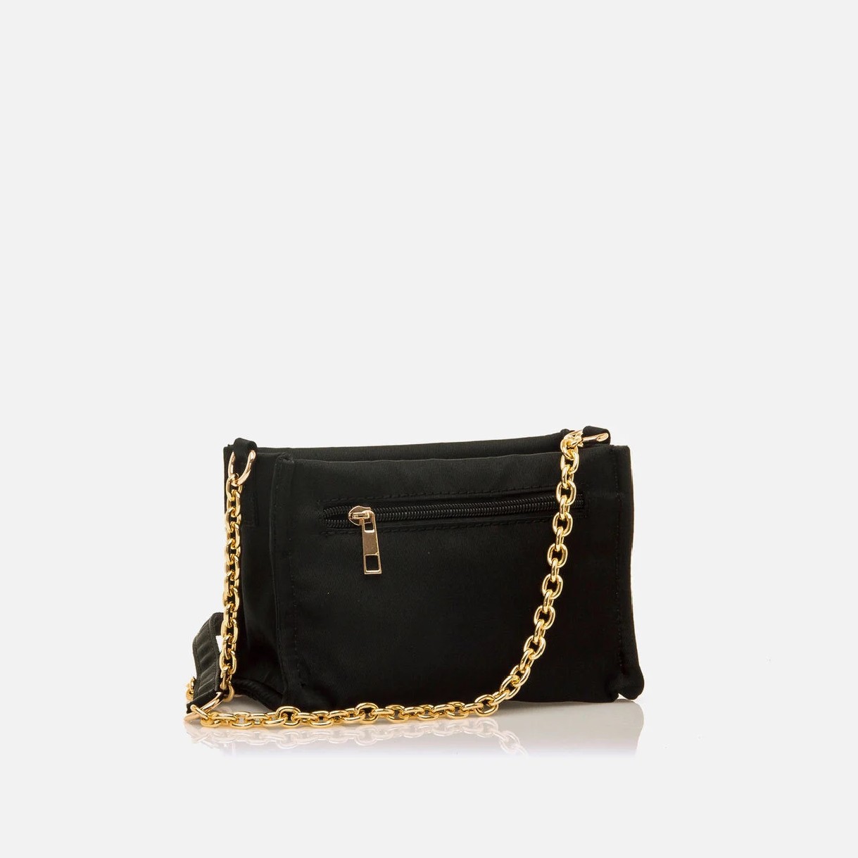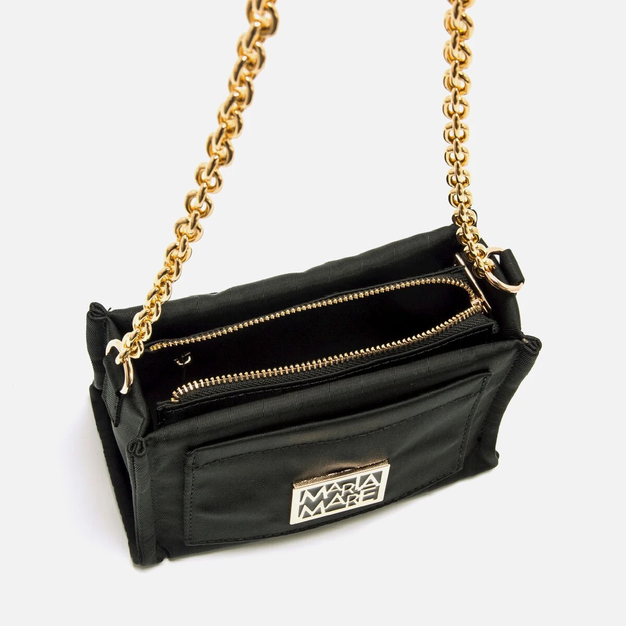 Bolso de color negro para mujer de la marca Mariamare modelo Dauma de estilo bandolera. Su diseño compacto con estructura rectangular lo convierte en una opción ideal para salidas rápidas o eventos donde solo se necesita lo esencial. Incluye una cadena dorada, que aporta un toque moderno y contrasta con el tono oscuro del cuerpo del bolso. El logo metálico sobre el bolsillo frontal añade un punto distintivo y elegante, manteniendo la funcionalidad gracias al cierre con cremallera superior.