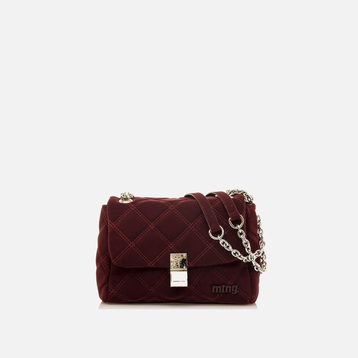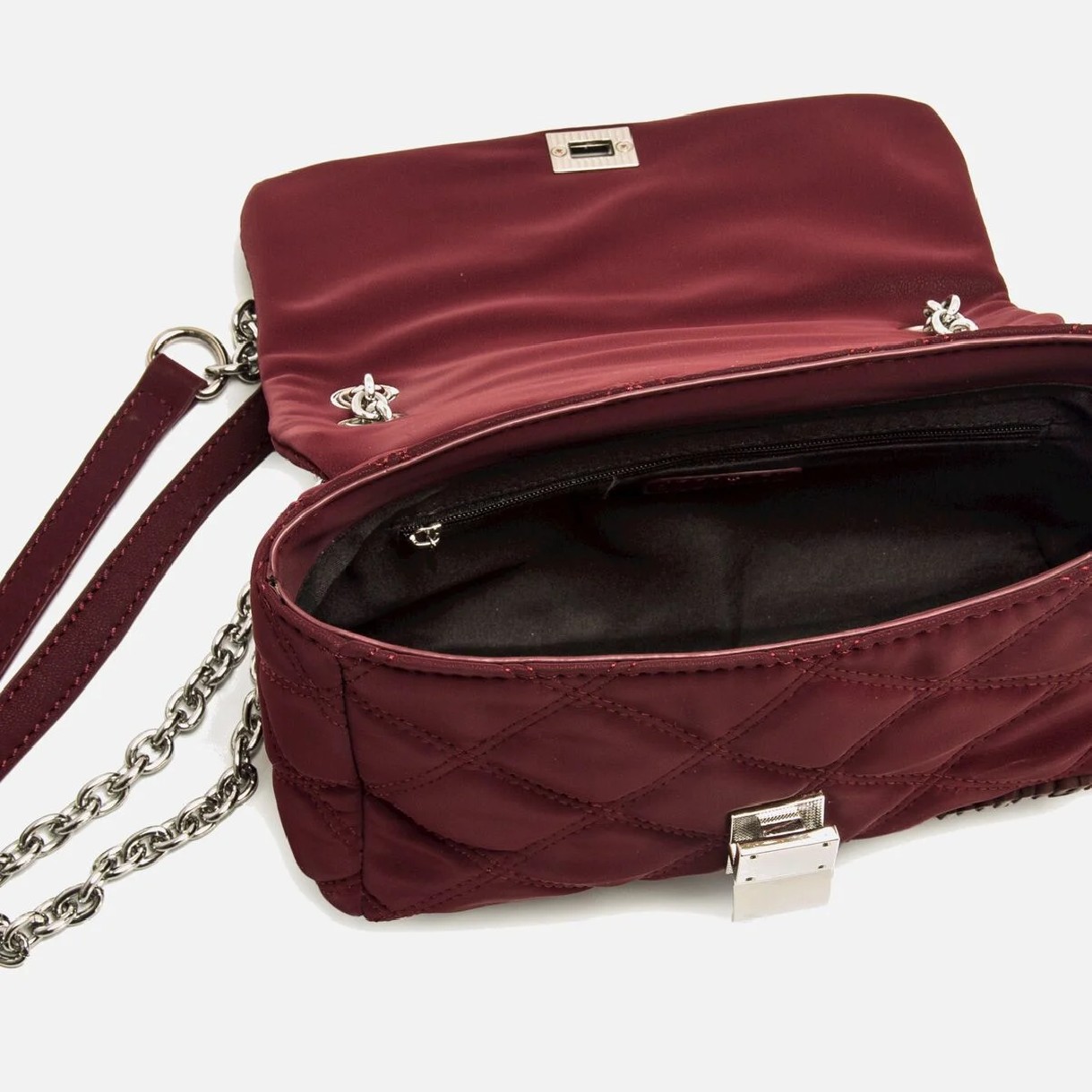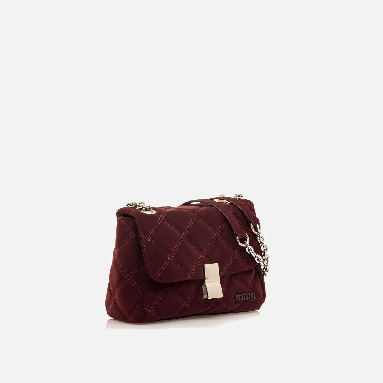 Bolso burdeos tipo bandolera de Mustang para mujer, modelo June con acabado acolchado y costuras en forma de rombo que aportan textura y estilo. Diseño con solapa y cierre metálico en tono plata que contrasta elegantemente con el color del bolso. Doble asa de cadena combinada con refuerzos que añaden comodidad para llevar al hombro. Interior amplio con compartimento forrado y bolsillo interior con cremallera. Un diseño versátil y actual que añade color a tus looks urbanos.