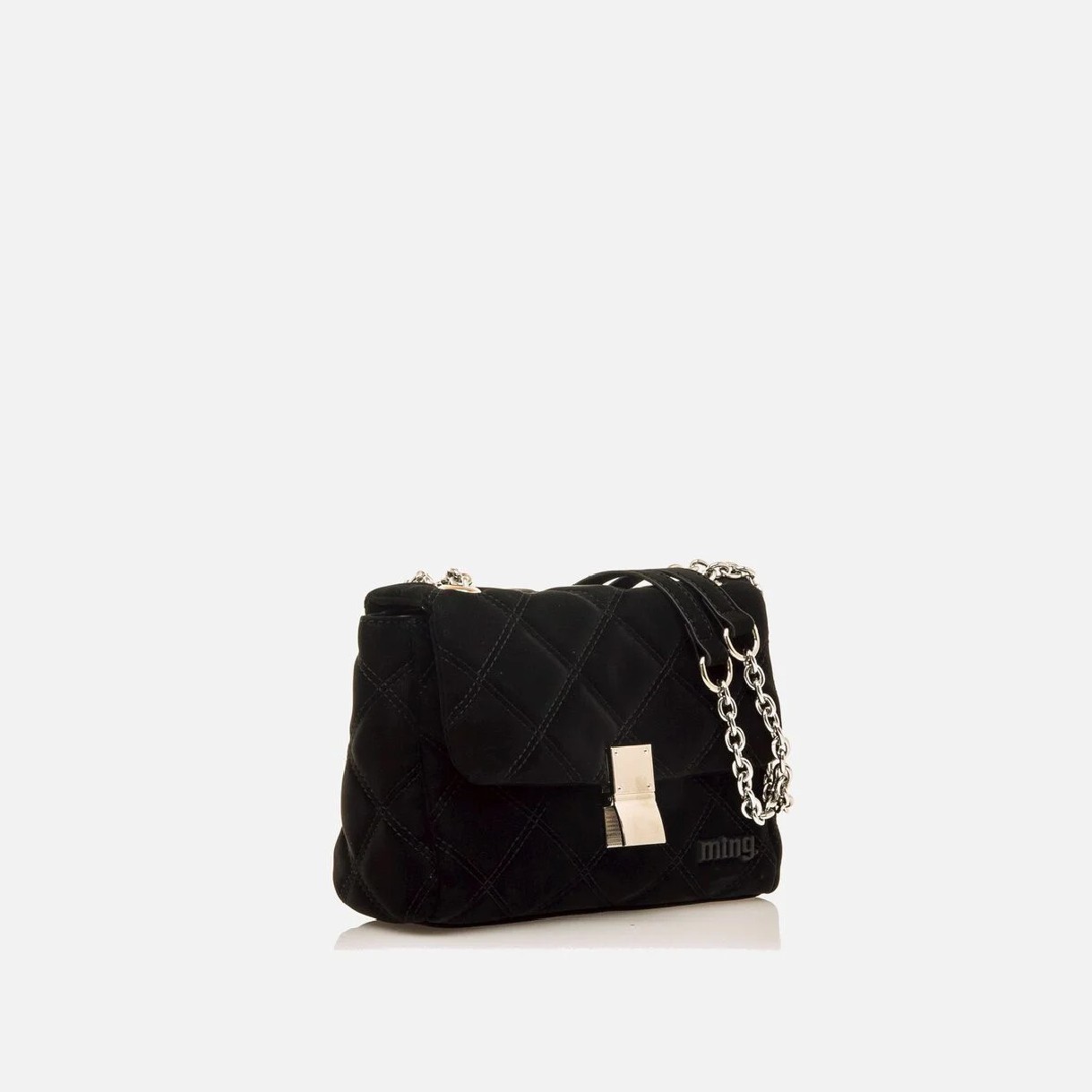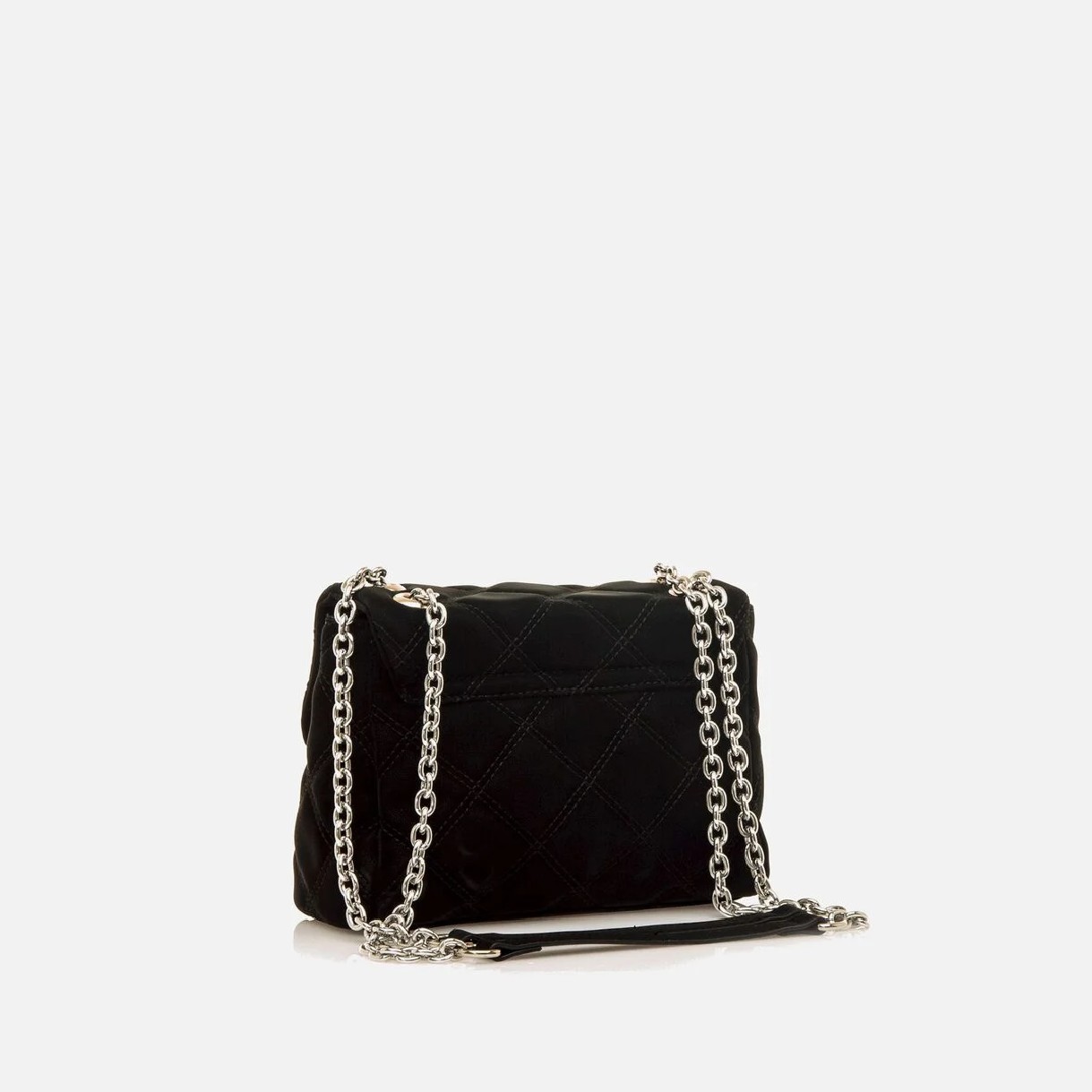 Bolso tipo bandolera negro para mujer de la marca Mustang, modelo June. Diseño acolchado con pespuntes en forma de rombo, solapa frontal con cierre metálico y logo negro. Incorpora una doble cadena metálica con refuerzo para mayor comodidad al hombro. Interior con compartimento principal forrado y bolsillo con cremallera para objetos pequeños. Un modelo sofisticado y funcional, ideal para elevar tus looks tanto de día como de noche.