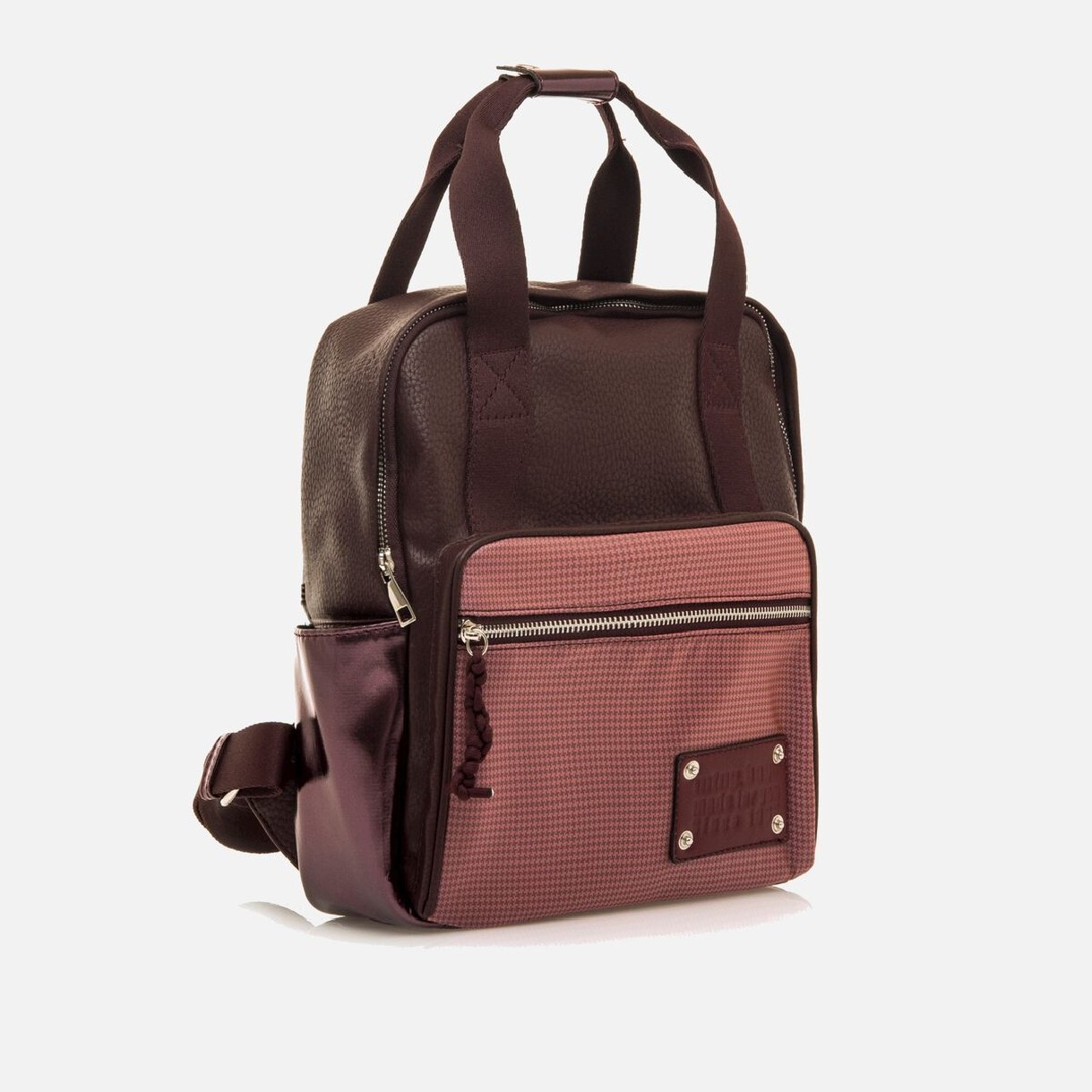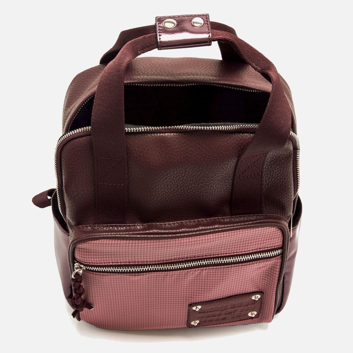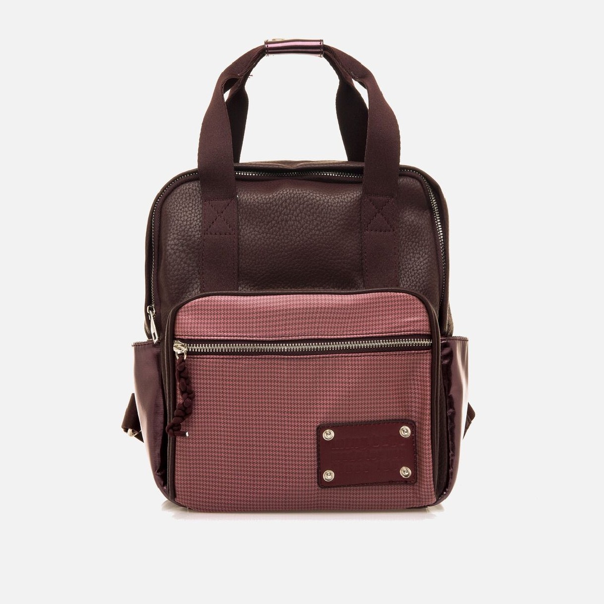 Mochila Mustang de color burdeos para mujer modelo Care de estilo casual cuadrado con estructura semirrígida. Combina paneles en distintos acabados y frontal texturizado en tono rosa con cremallera y placa decorativa. Cuenta con asas superiores de mano, correas ajustables y bolsillos laterales metalizados, lo que la hace práctica y versátil para el día a día.