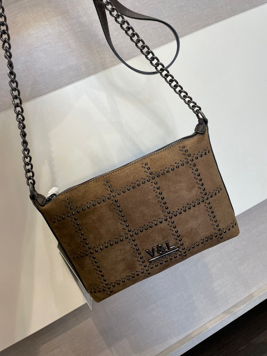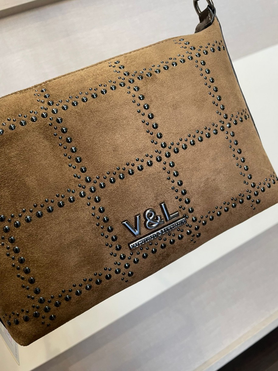 Bolso de bandolera en color marrón de Victorio & Lucchino. La parte delantera es de antelina con tachuelas, mientras que la trasera es de polipiel, con una cremallera.