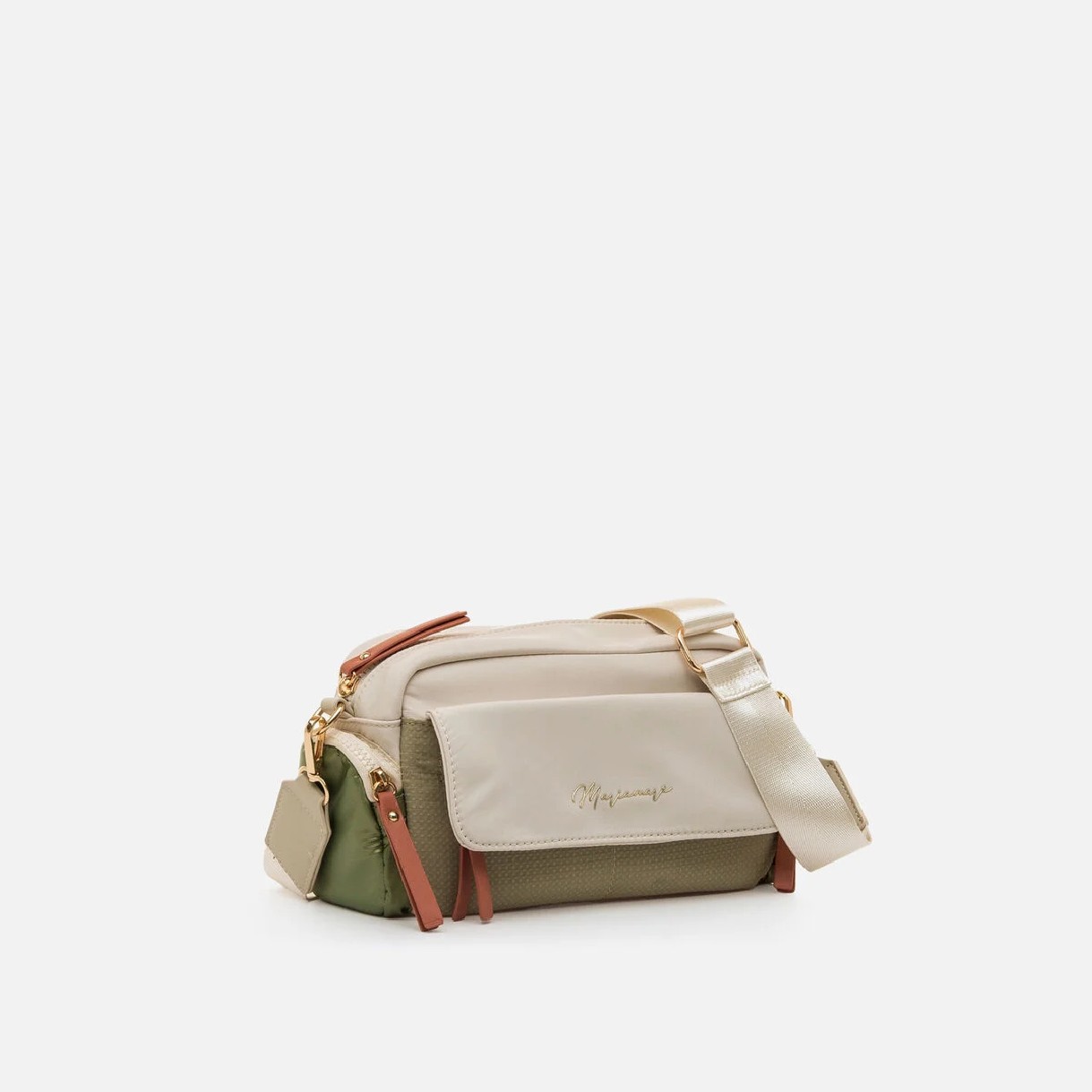 Bolso bandolera para mujer de la marca Mariamare, modelo Mesa de color beige con detalles en verde y rosa. Este diseño combina distintos tonos y texturas para un look desenfadado y funcional. Incorpora varios compartimentos con cierre de cremallera a los laterales y solapa frontal, ideales para mantener el contenido organizado. El asa ancha y regulable permite un ajuste cómodo al hombro o cruzado. Su tamaño compacto lo convierte en una opción versátil para quienes buscan practicidad sin renunciar al diseño.