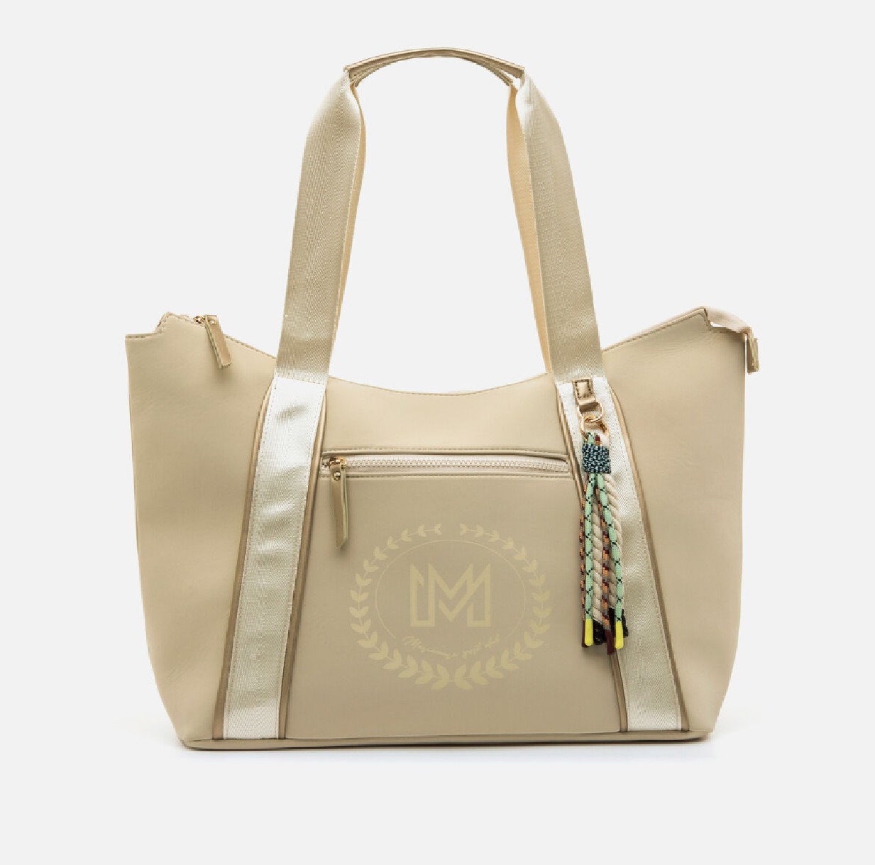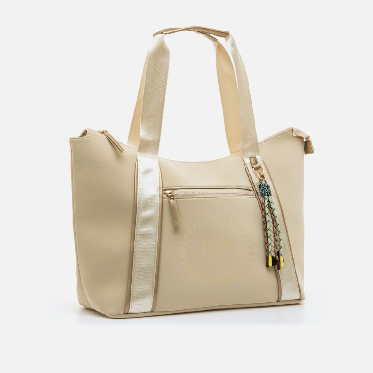 Bolso de color crema para mujer de Mariamare, modelo Lodos con diseño tipo shopper y un aire deportivo. Incorpora asas anchas con acabado brillante que aportan comodidad al llevarlo al hombro