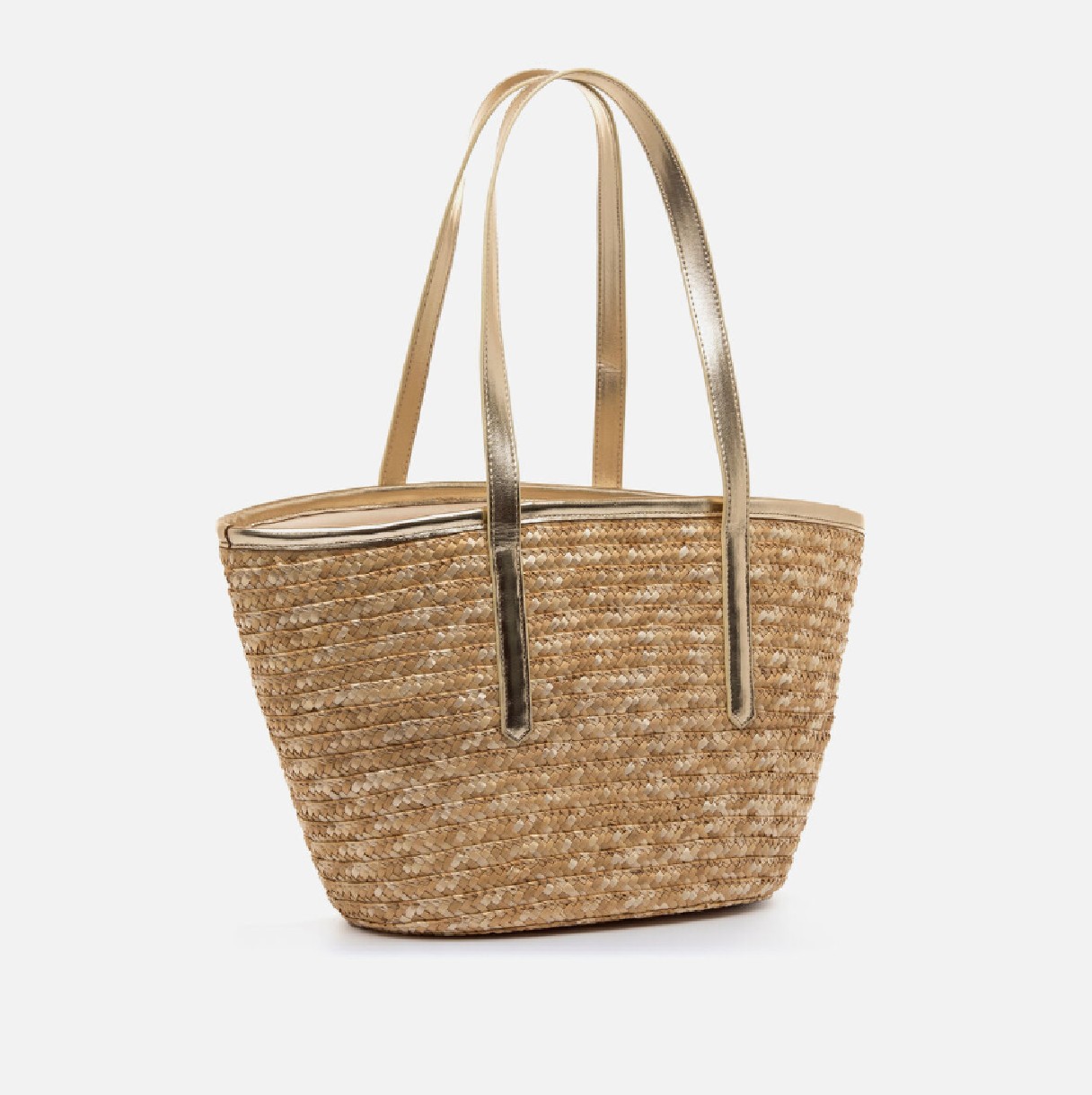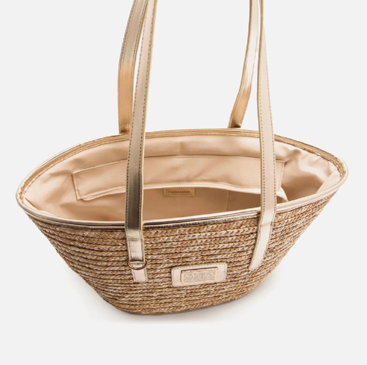 Bolso capazo de color natural para mujer, modelo Aloha de Mariamare diseñado con cuerpo trenzado de paja y detalles de color dorado que aportan un toque actual. Incorpora asas largas para llevar cómodamente al hombro y un interior amplio con forro y bolsillo auxiliar que facilita la organización. Su formato estructurado lo convierte en una opción práctica para combinar con looks veraniegos, aportando ligereza visual y un aire fresco sin renunciar a la funcionalidad.
