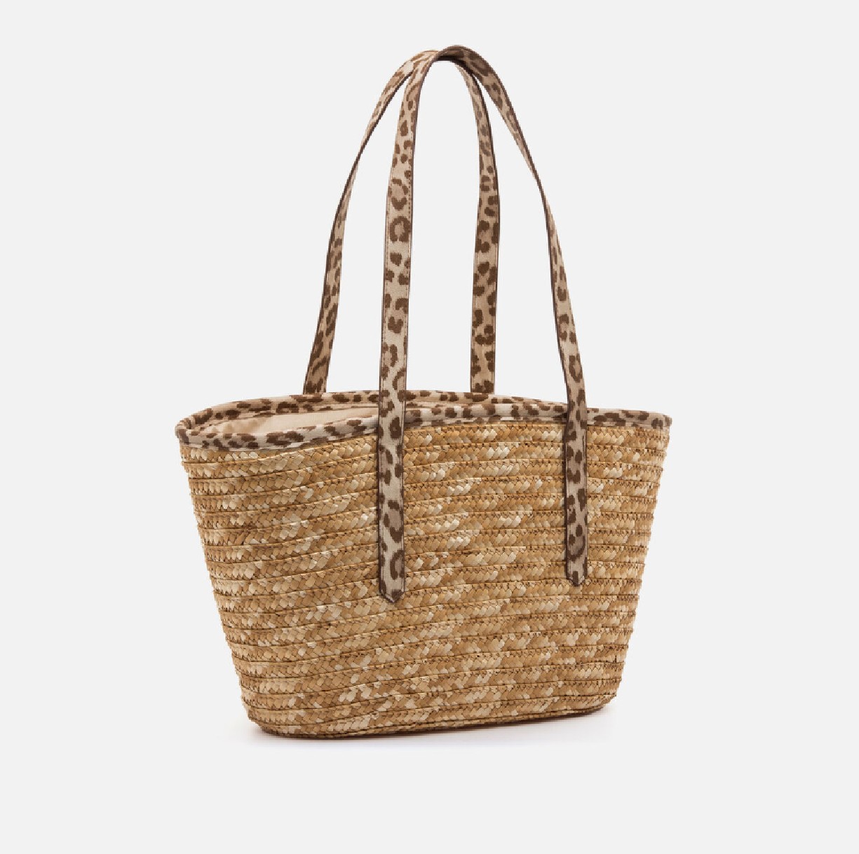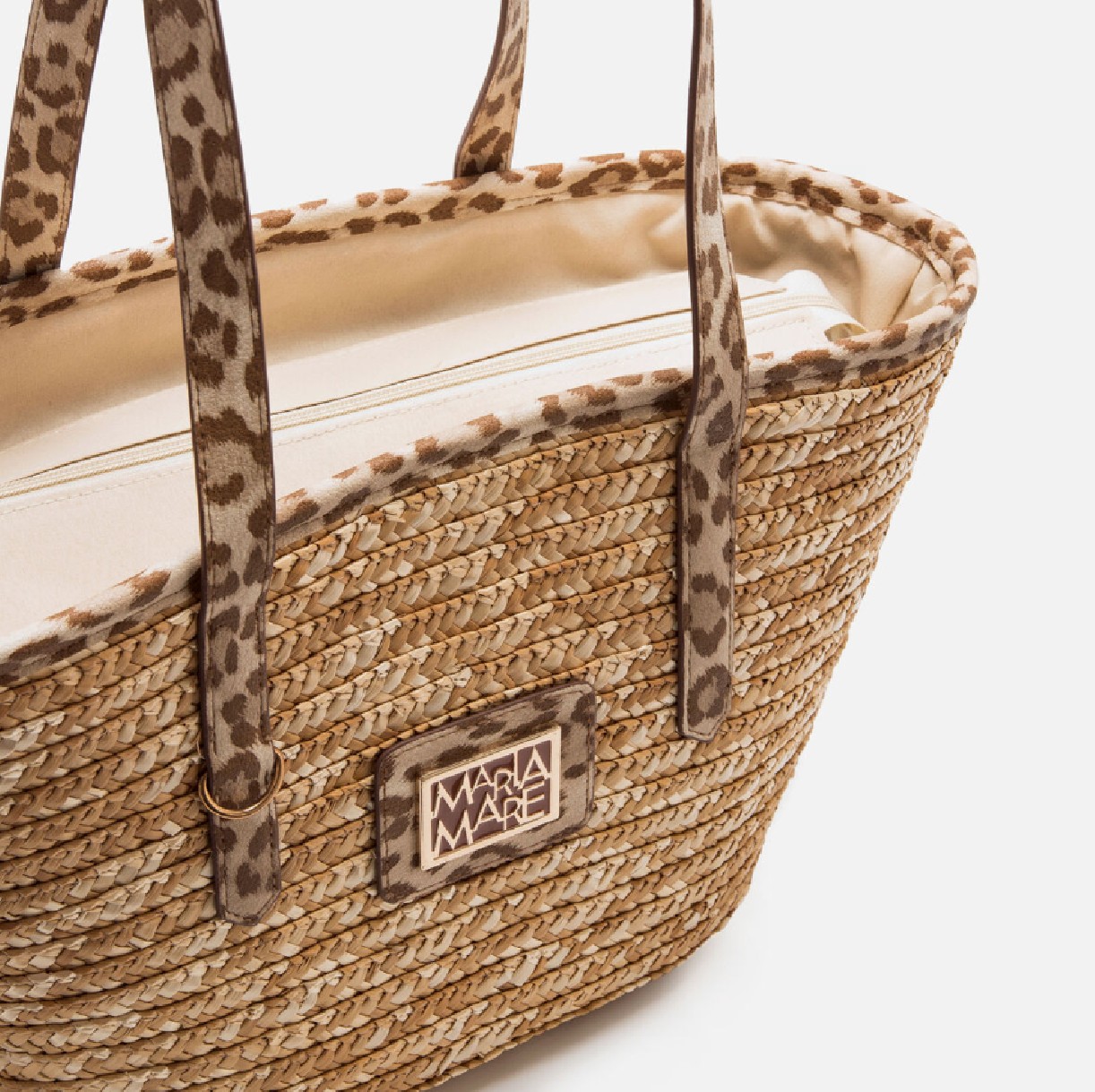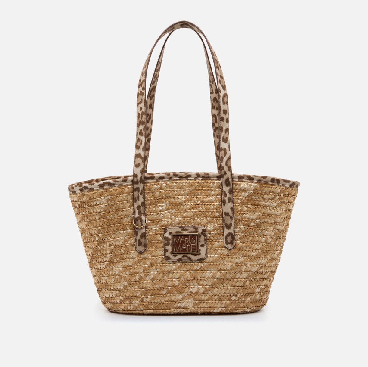 Bolso capazo de paja para mujer, modelo Aloha de Mariamare, ideal para completar looks de temporada con un toque actual. Su diseño combina cuerpo trenzado con asas largas de estampado animal de leopardo, aportando contraste y personalidad al conjunto. El formato amplio permite llevar cómodamente todo lo necesario, mientras que el interior forrado ayuda a mantener el contenido más organizado. Incluye detalle frontal con logo de la marca que refuerza su identidad y bolsillo auxiliar interior. Una opción versátil para acompañar planes urbanos o escapadas de fin de semana.