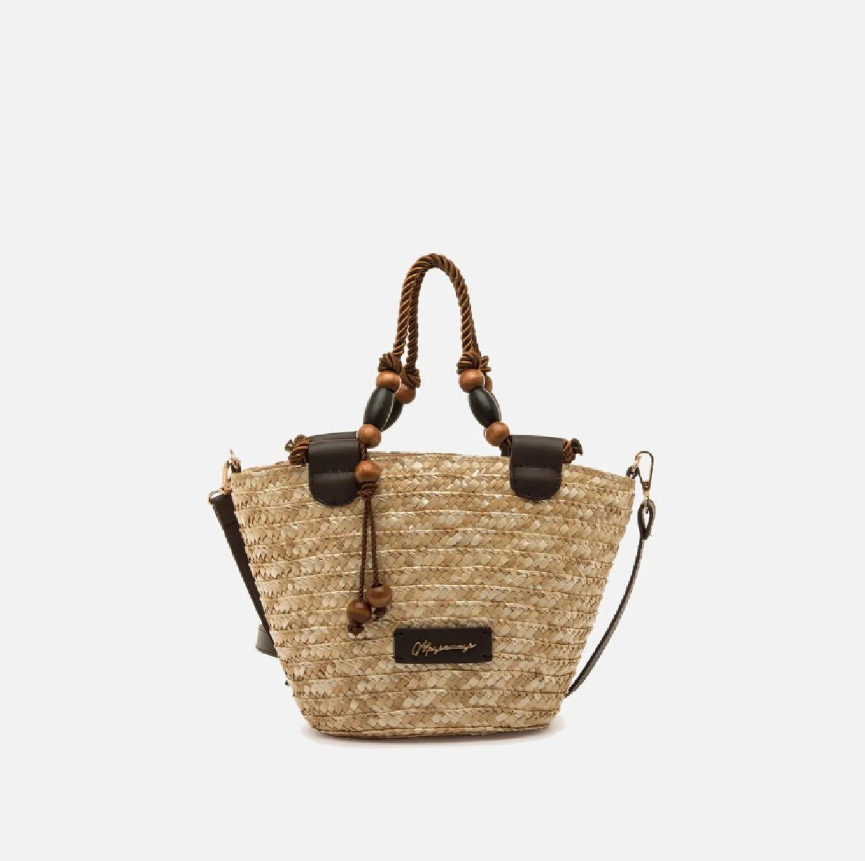 Bolso tipo capazo de paja de color natural para mujer, modelo Saro de Mariamare, diseñado para aportar un aire fresco y funcional a los looks de temporada. Su estructura trenzada se combina con asas cortas de cuerda con cuentas decorativas que añaden un detalle distintivo, además de una bandolera marrón moka ajustable para mayor versatilidad. El formato compacto permite llevar lo imprescindible de forma cómoda, mientras que el interior forrado con cierre de cremallera facilita la organización. Incluye placa frontal con el logo de la marca que refuerza su identidad.