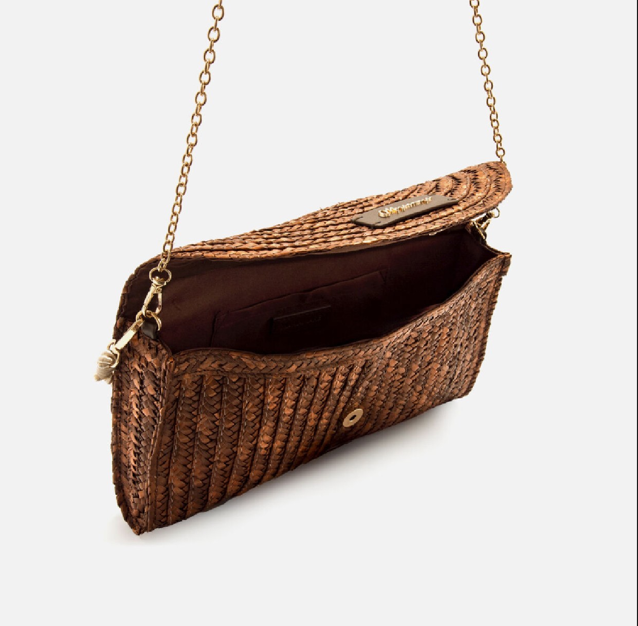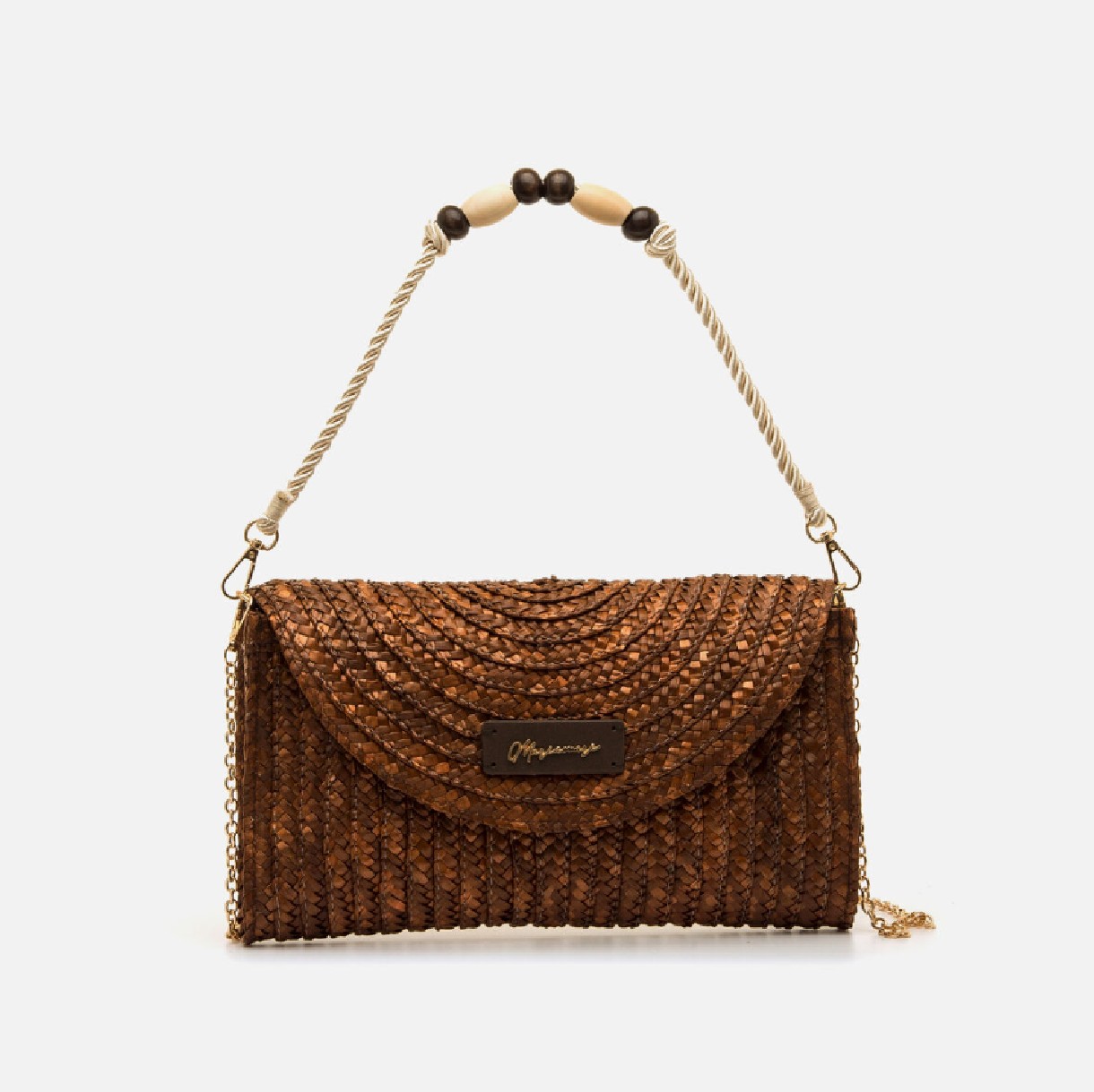 Bolso tipo clutch de color marrón de la marca Mariamare, modelo Socha. Elaborado en paja trenzada con forma rectangular y solapa semicircular. Incluye asa corta decorada con cuentas de madera y cuerda, y una fina cadena dorada desmontable para llevarlo al hombro o cruzado. El cierre es de botón imantado y el interior está forrado, con un bolsillo auxiliar para pequeños objetos. Un complemento ideal para looks veraniegos o de estilo boho, que combina funcionalidad con un acabado artesanal.