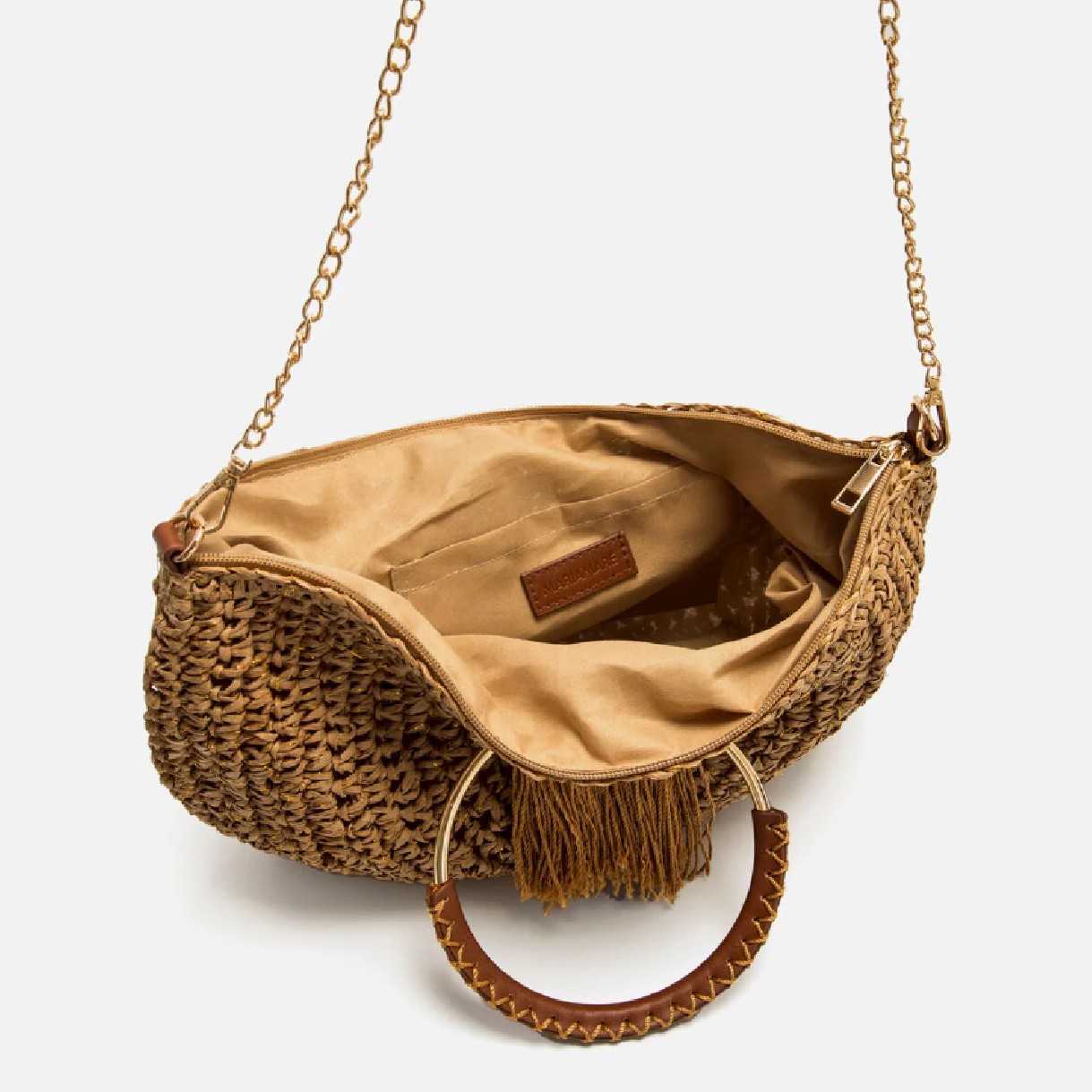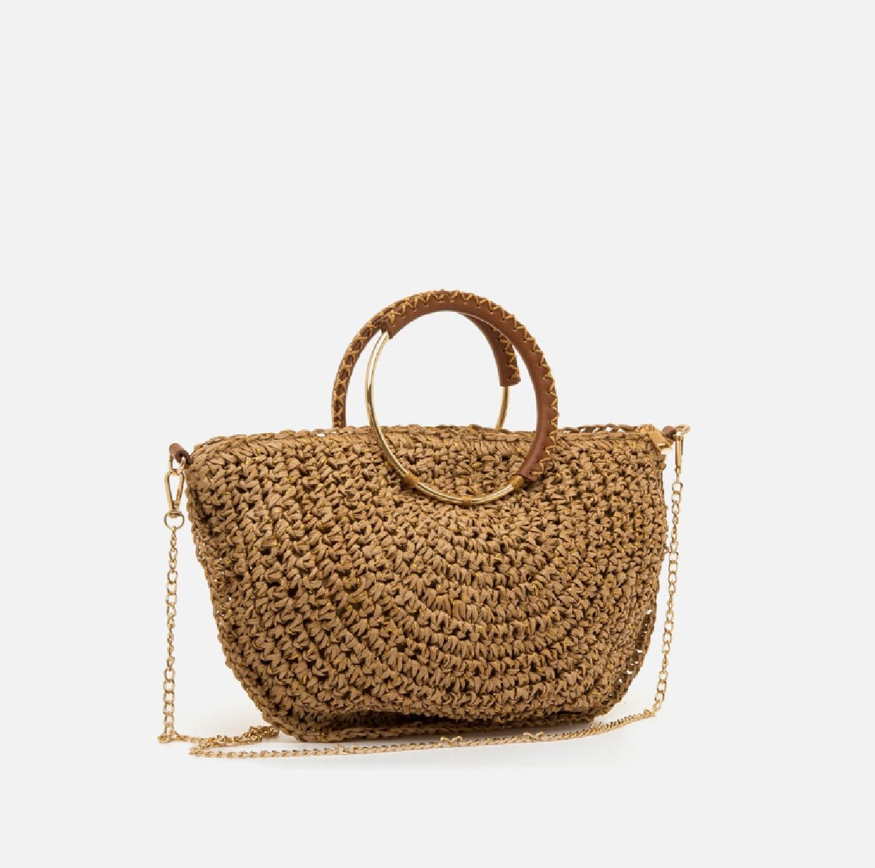 Bolso de mano de la marca Mariamare, modelo Tempo, con diseño tipo capazo en tono natural. Confeccionado en rafia de papel trenzada con forma semicircular y decorado con un llamativo borlón en la parte frontal. Sus asas redondas metálicas con detalle en polipiel marrón cuero aportan un toque sofisticado, mientras que la cadena dorada desmontable permite llevarlo también al hombro o cruzado. Cuenta con cierre de cremallera y forro interior con bolsillo auxiliar. Un bolso elegante y veraniego, ideal para completar looks boho o casual chic.