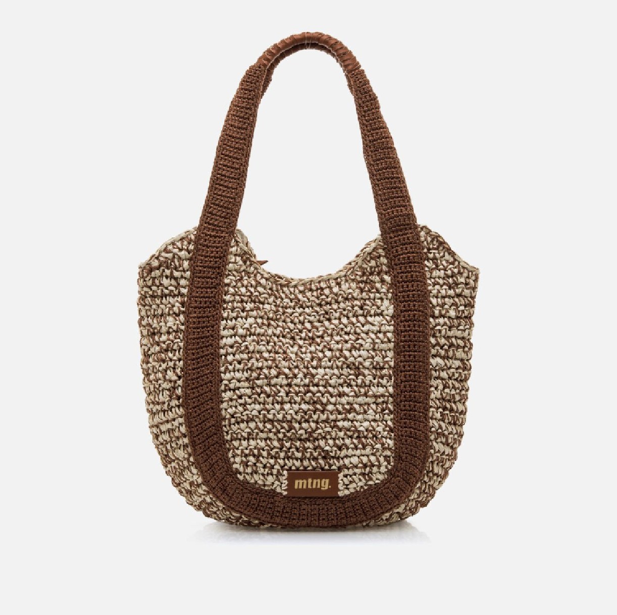 Bolso tipo hobo de color beige con detalles marrones para mujer, modelo Mar de Mustang diseñado con un acabado trenzado. Su formato curvado y ligero de rafia lo hace cómodo de llevar, adaptándose fácilmente al hombro. Dispone de asas anchas de macramé que ofrecen un buen apoyo, y un interior forrado con cierre de cremallera, ideal para guardar tus objetos personales con mayor seguridad. El logo frontal añade un detalle reconocible que completa un diseño fácil de combinar.